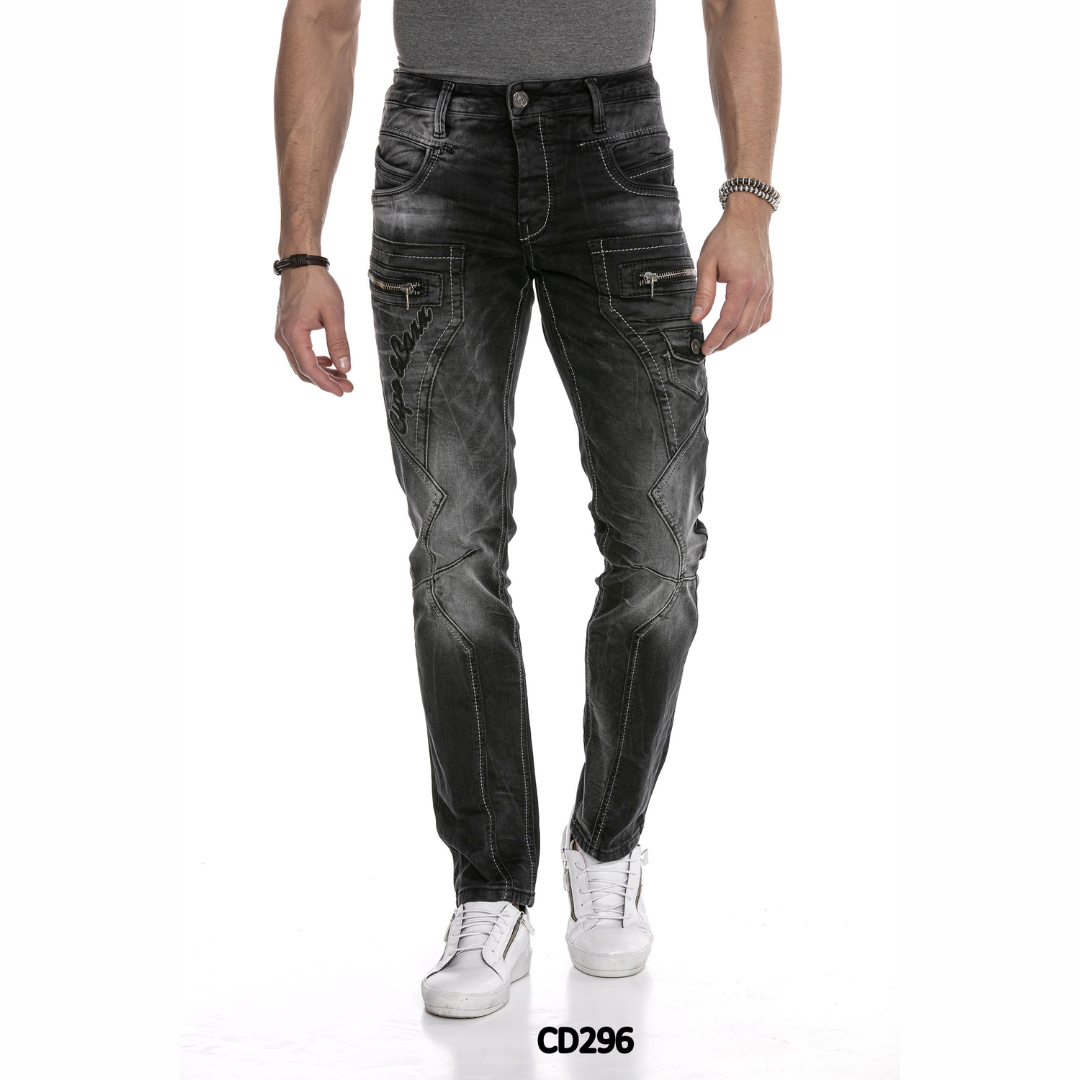 Cipo & Baxx kulutuspesty harmaa farkku, jossa näyttävät ykstyiskohdat. Normaali istuvuus, joustava materiaali. Vetoketju + nappi kiinnitys.