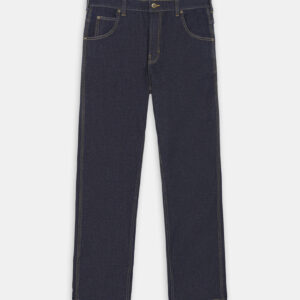 Dickies tummansininen kuluttamaton farkku. Rento istuvuus, suora lahje. Normaali vyötärön korkeus. 5-tasku malli, jossa toisessa takataskussa Dickies merkki. Vetoketju kiinnitus. Joustamaton materiaali.