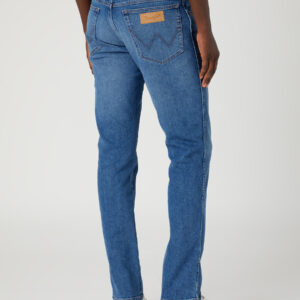 Wrangler keskisininen farkku. Normaali vyötärön korkeus, vetoketju/nappi kiinnitys. Vyölenkit, 5-taskumalli. Suora lahje, normaali reiden leveys. Joustava materiaali.
