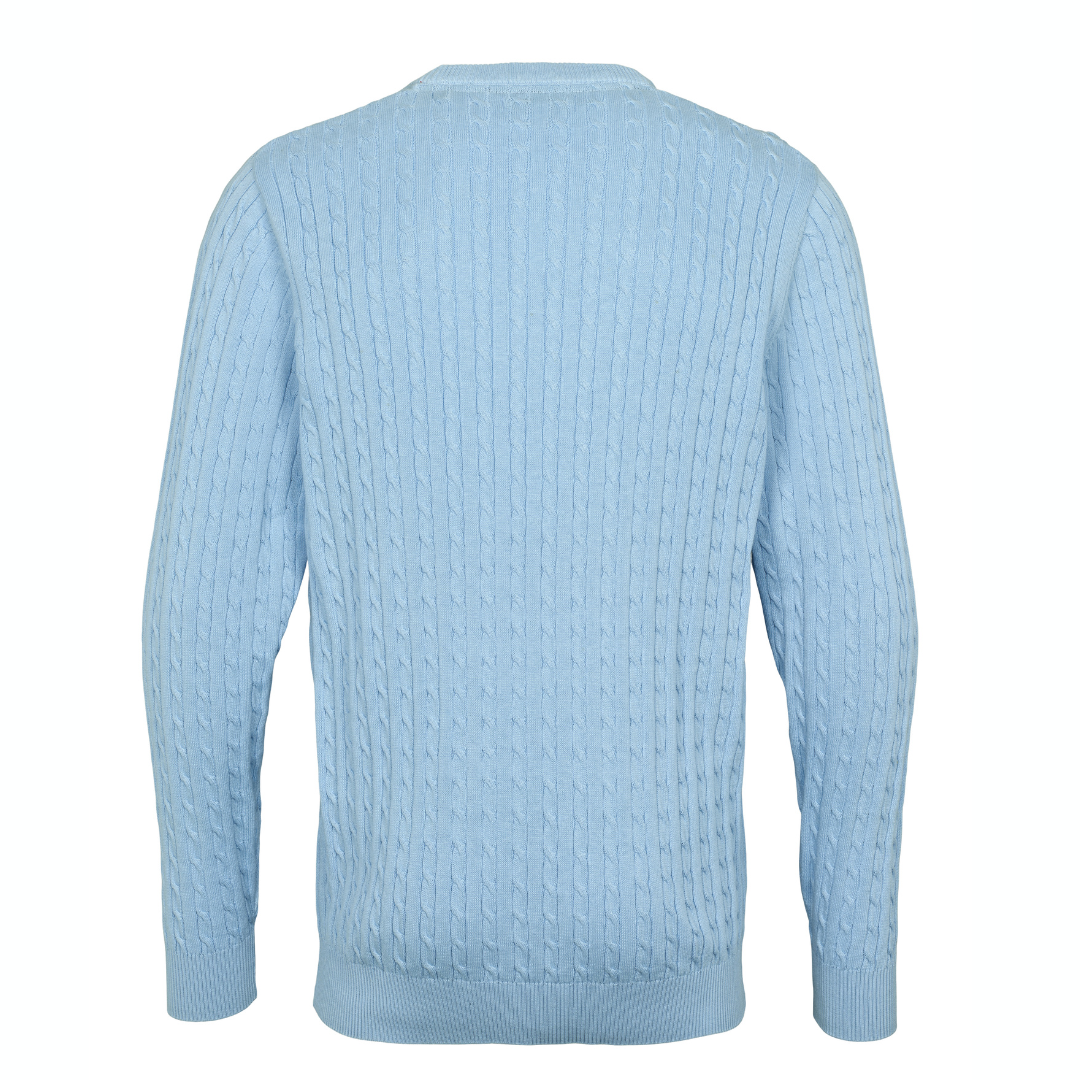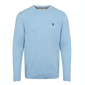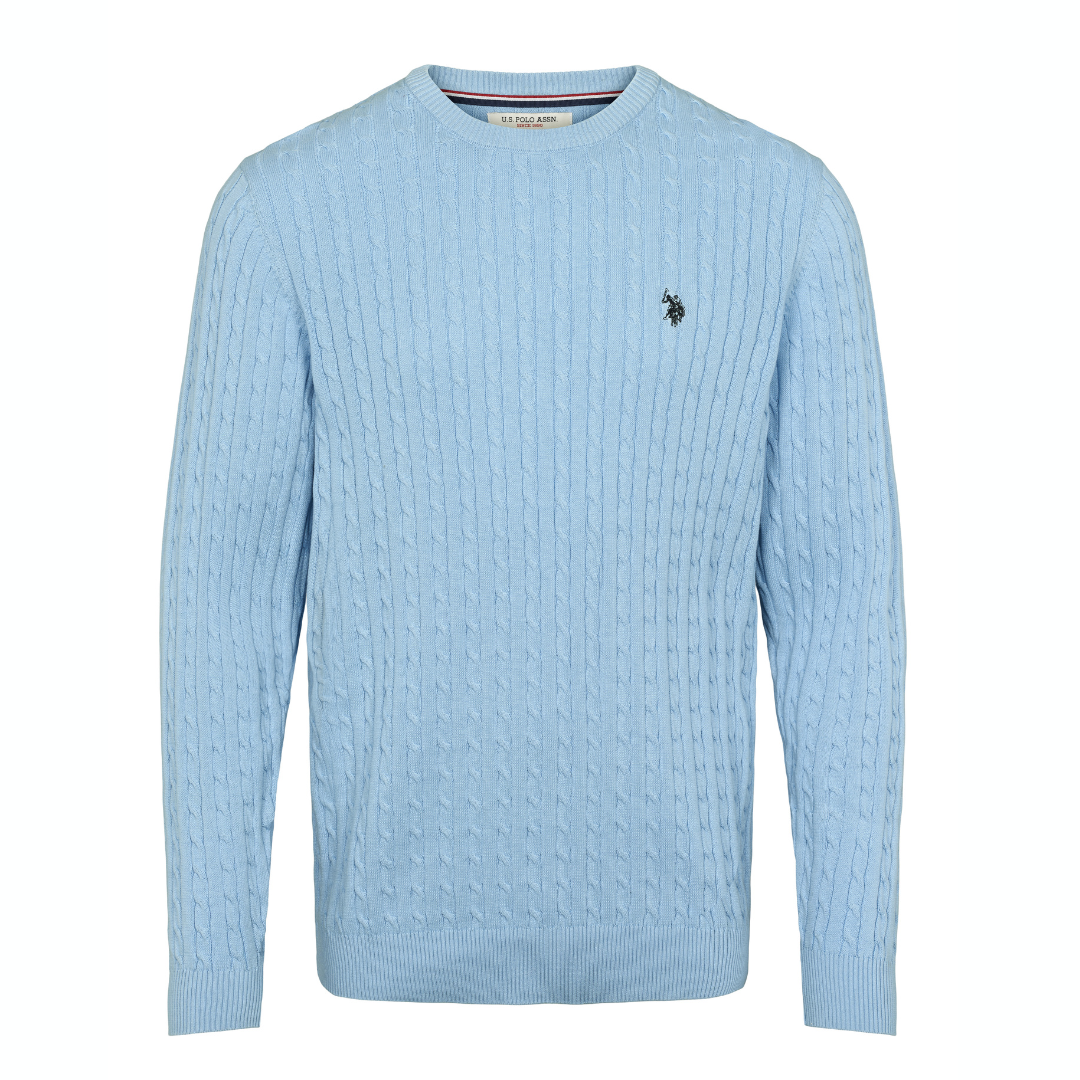 U.S.Polo ASSN. vaaleansininen neulepaita. Eläväpintainen palmikko kuosi. Edessä pieni brodeerattu merkki. O-pääntie, hihansuissa ja helmassa resorit. Normaali mitoitus.