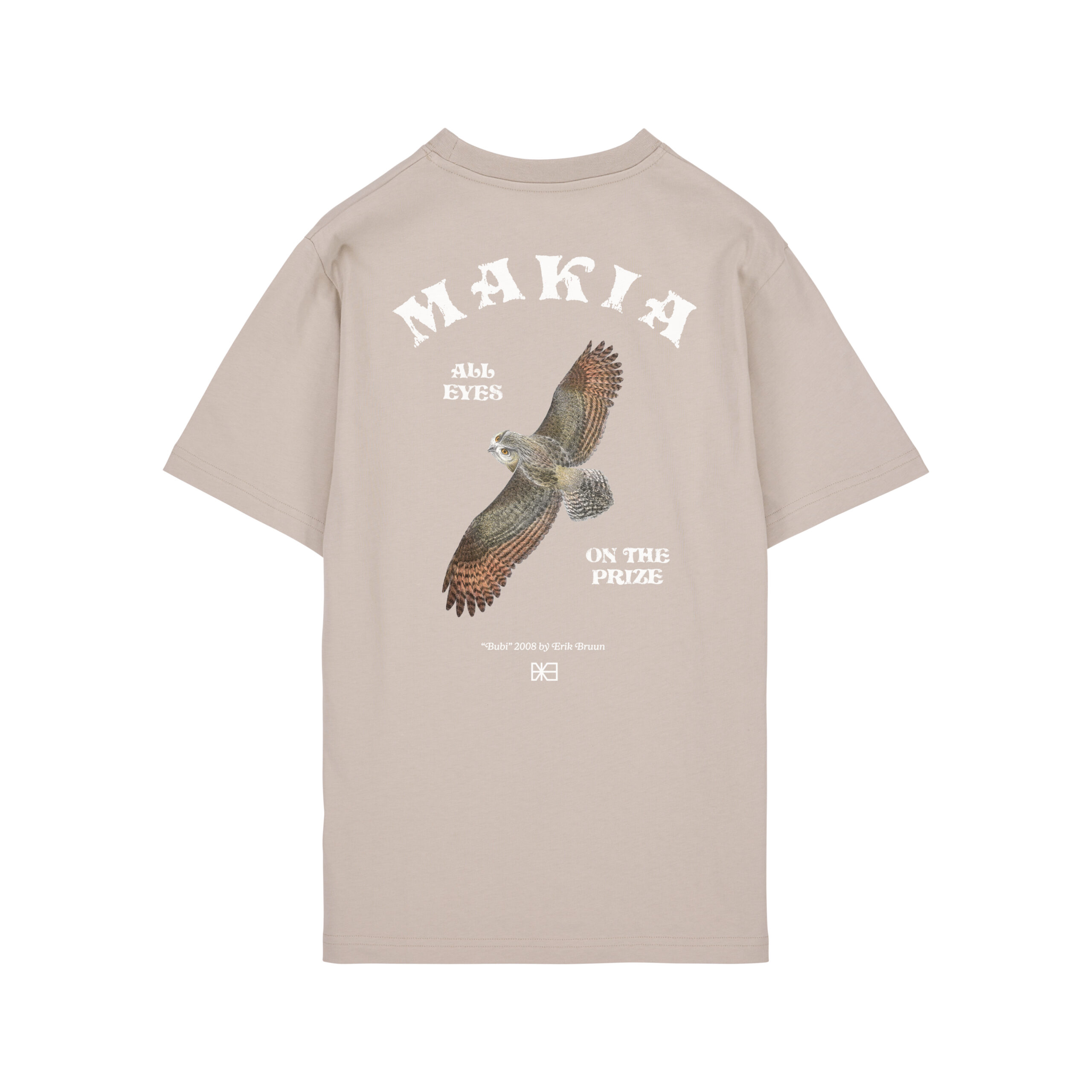 Makia Khakin värinen T-paita. Tämä tuote kuuluu Erik Bruun -kapselimallistoon. Normaali istuvuus. O-pääntie. Edessä pieni painettu Makia teksti. Selkäpuolella iso painettu kuva.
