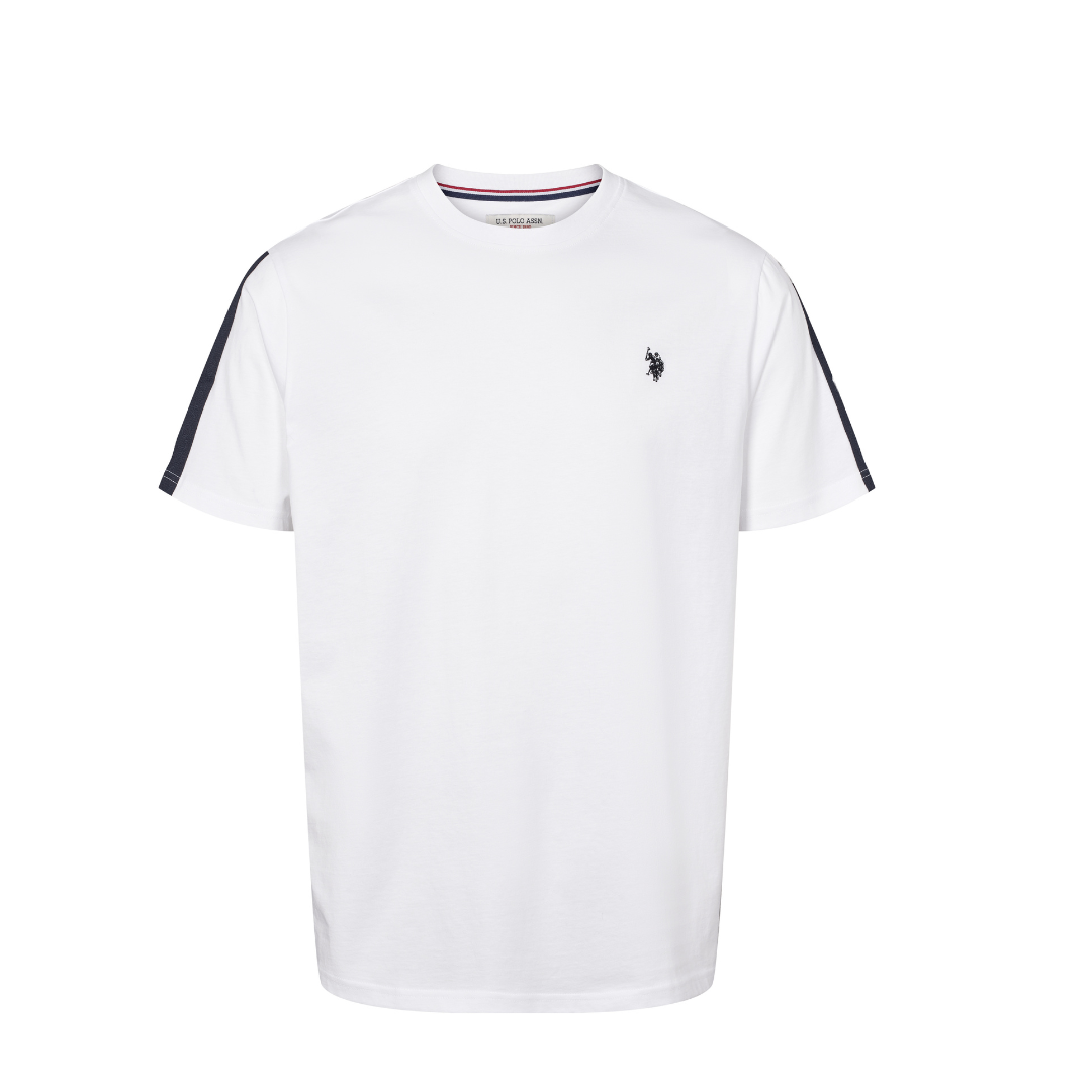 Tunnisteet: Polo T-paita, U.S. Polo ASSN., U.S. Polo T-paita, Valkoinen T-paitaU.S.Polo ASSN. valkoinen T-paita. Normaali mitoitus. Edessä pieni brodeerattu logo, hihoissa koristenauhat. O-pääntie.