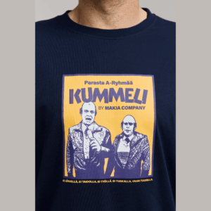Kummeli Forever By Makia Company tummansininen unisex T-paita. Normaali mitoitus, O-pääntie. Edessä painettu kuva.