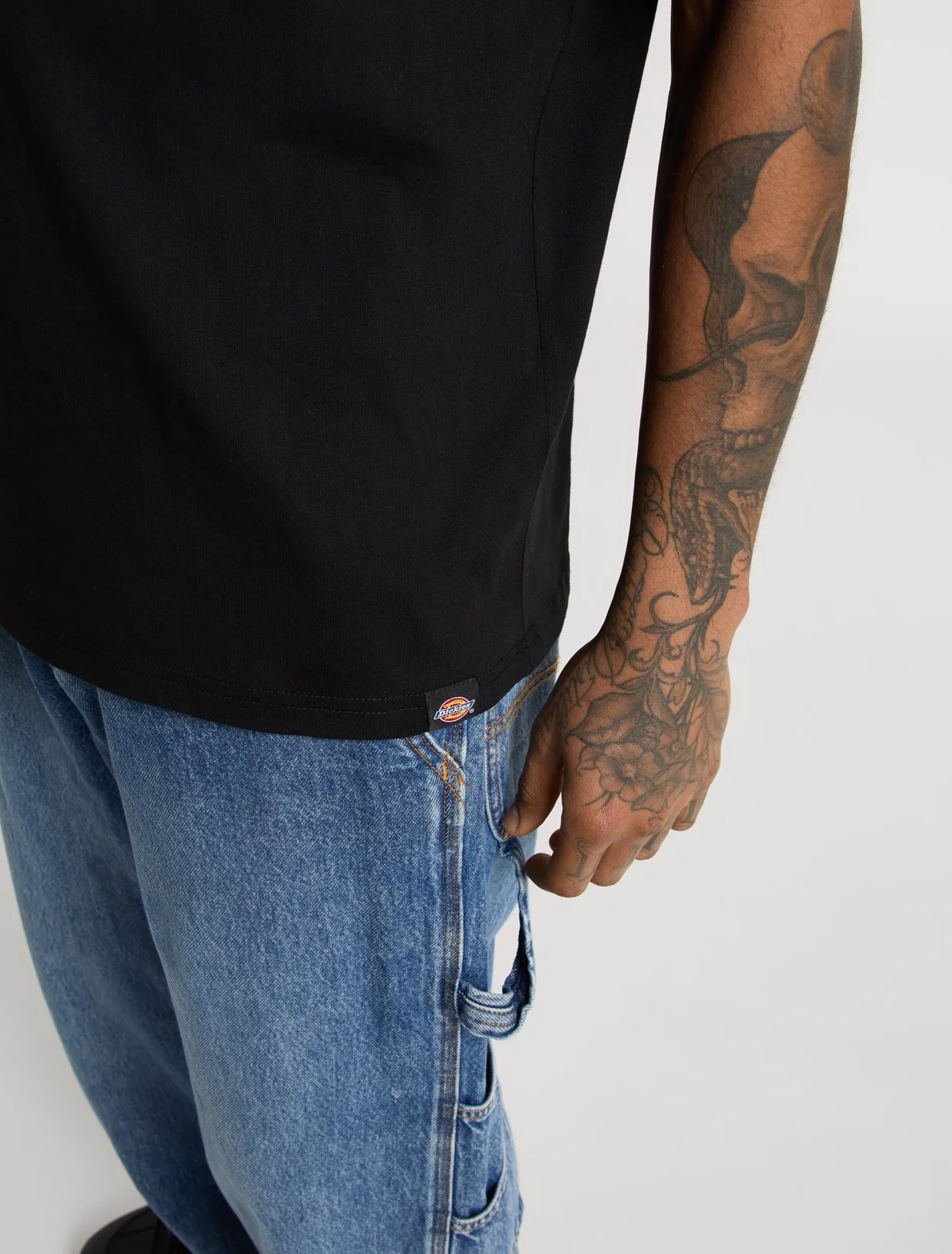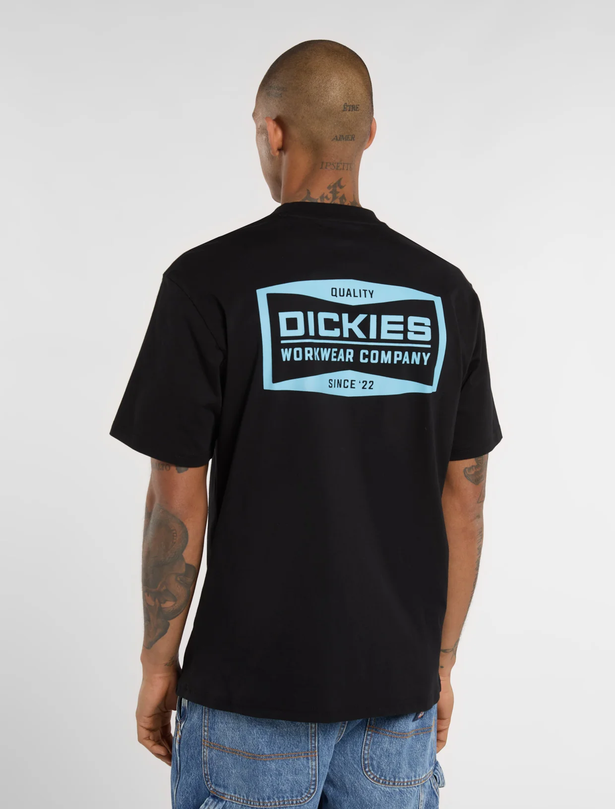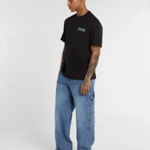 Dickies musta T-paita. Rento mitoitus. Edessä pieni painettu Dickies teksti. Selkäpuolella iso painettu kuva.
