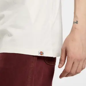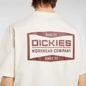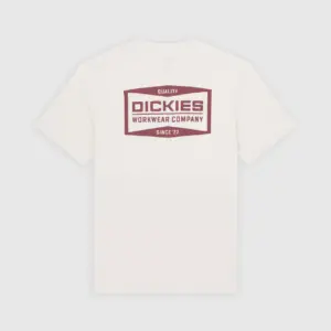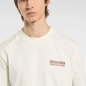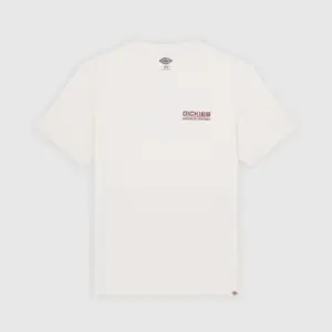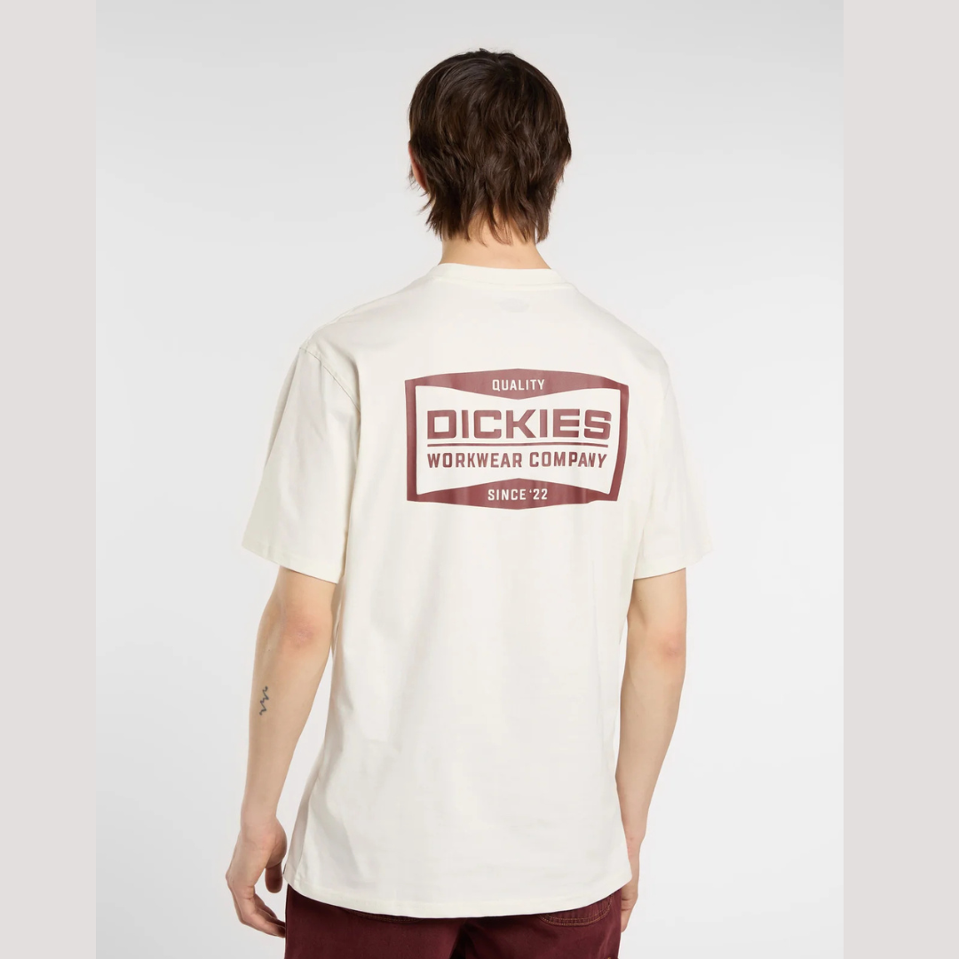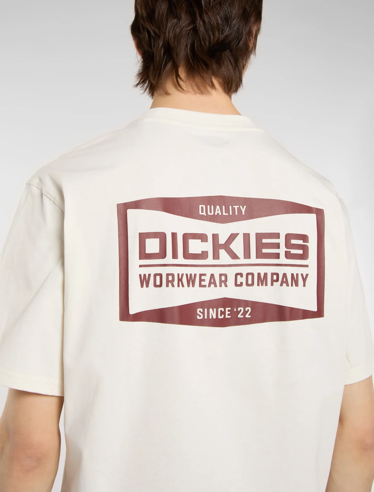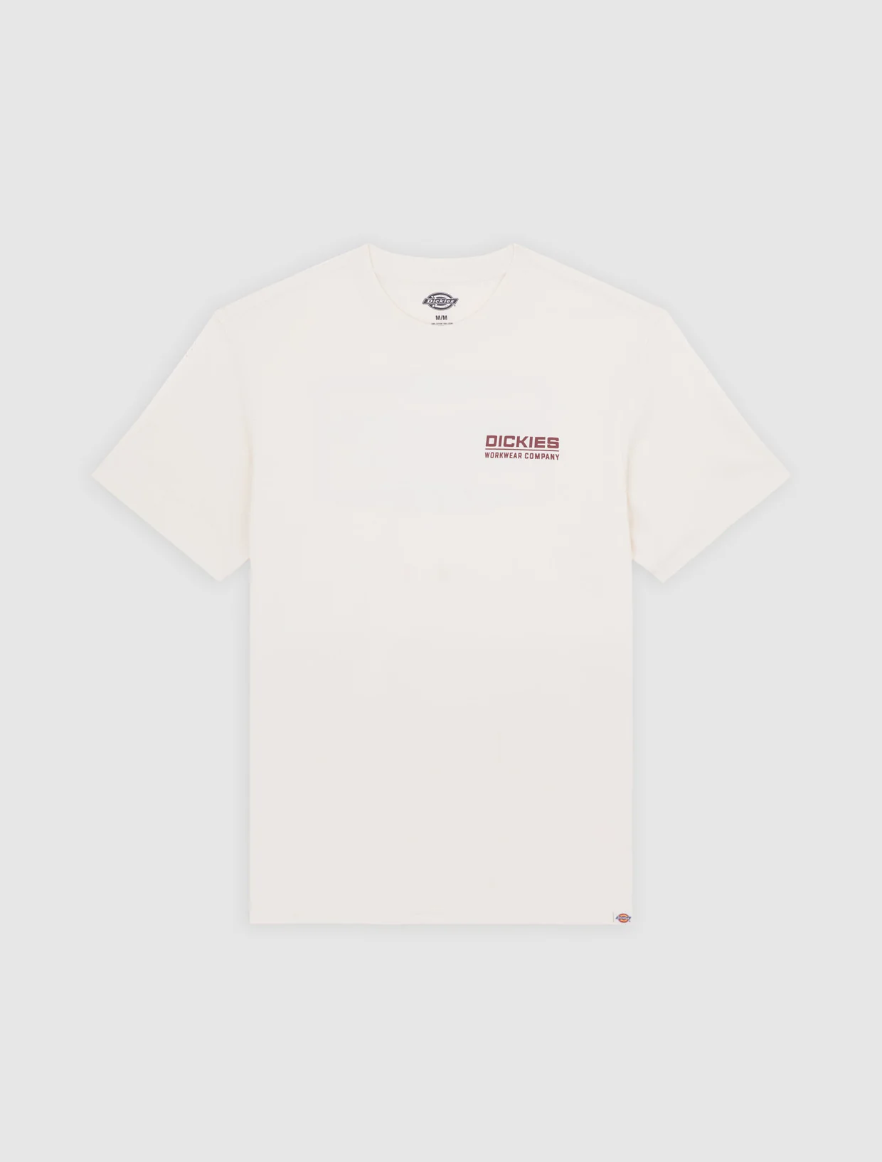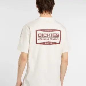 Dickies luonnonvalkoinen T-paita. Rento mitoitus. Edessä pieni painettu Dickies teksti, selkäpuolella iso painettu kuva.