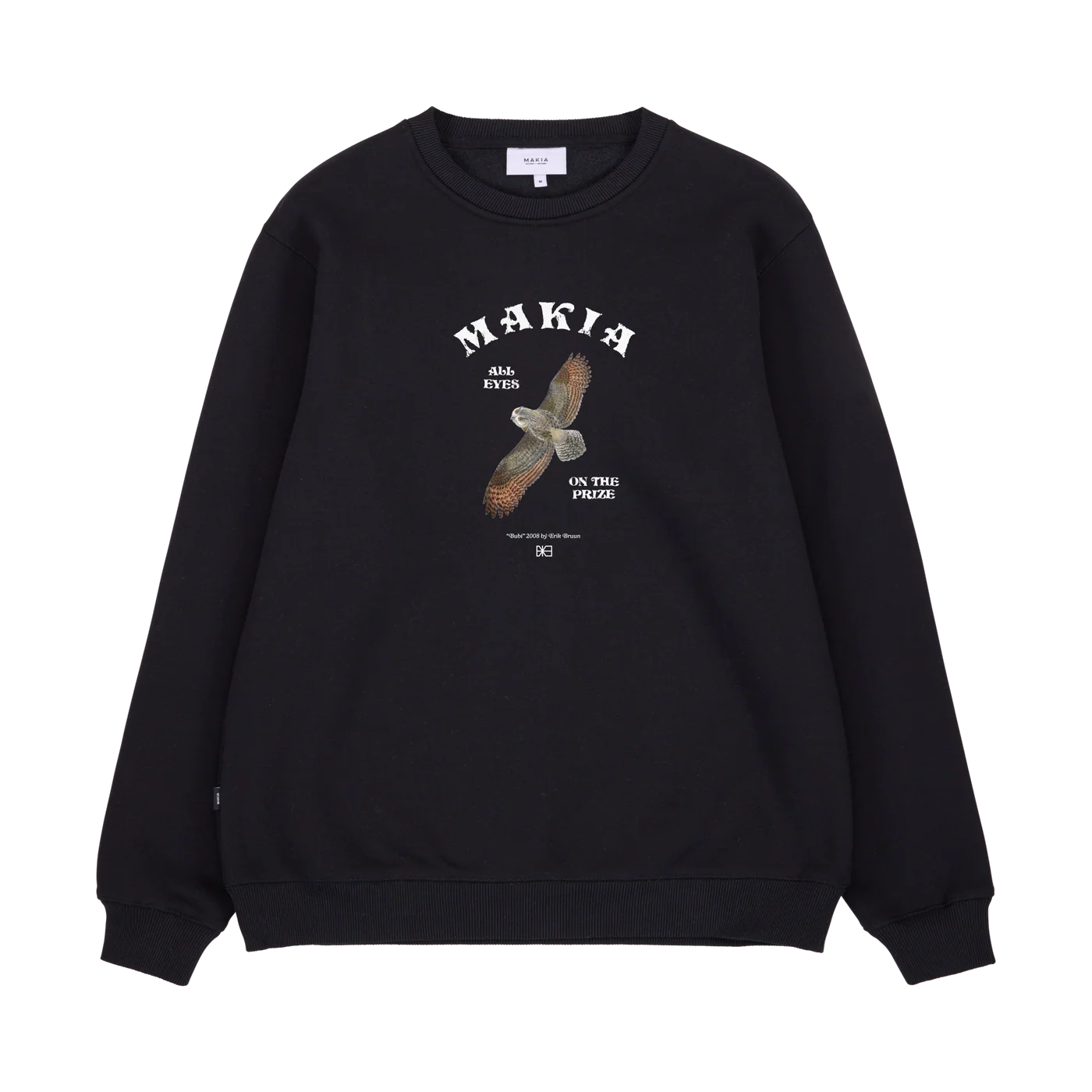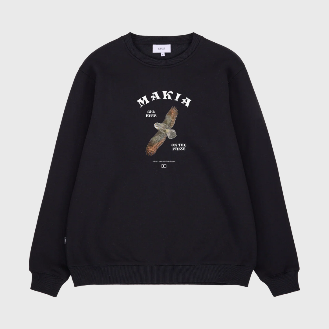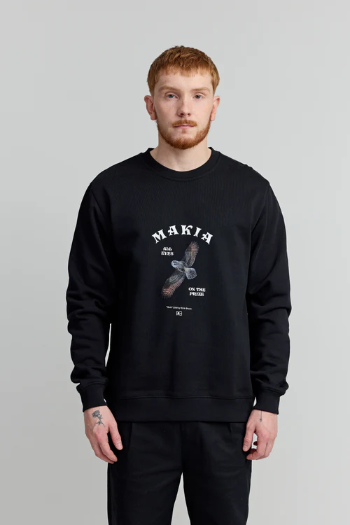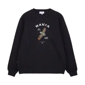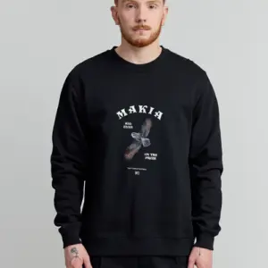 Makia musta swetari. Normaali mitoitus, O-pääntie. Frotee sisäpinta. Hihansuissa ja helmassa resorit. Edessä painettu kuva.