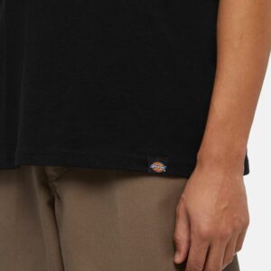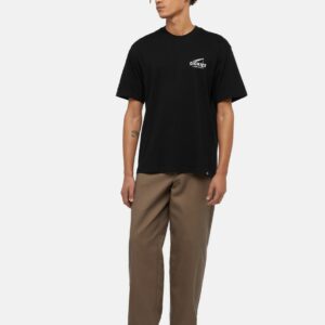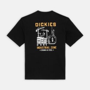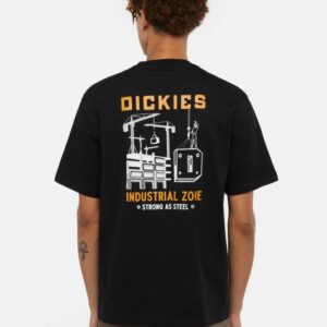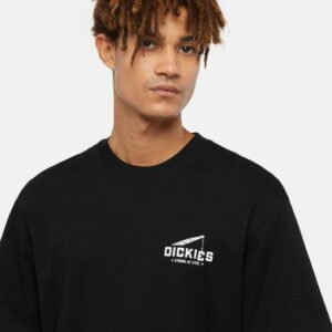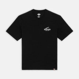 Dickies musta T-paita. Rento malli, O-pääntie. Edessä pieni painettu Dickies teksti, selkäpuolella iso painettu kuvio. Helmassa pieni Dickies merkki.