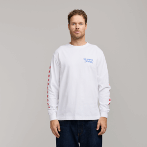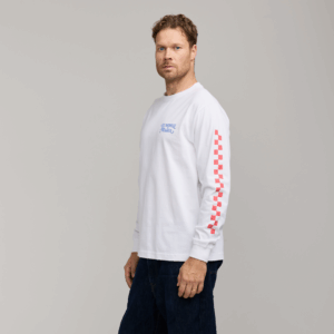 Kummeli Forever By Makia Company valkoinen unisex pitkähihainen T-paita. Normaali mitoitus. O-pääntie, suora helma, hihansuissa resorit. Edessä pieni painettu kuva, selkäpuolella iso painettu kuva. Molemissa hihoissa painettuja ruutuja.