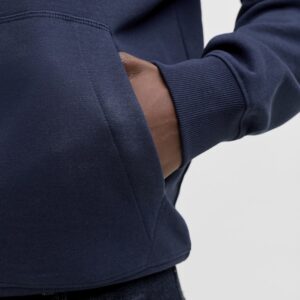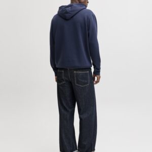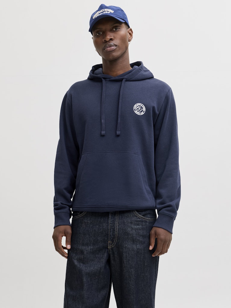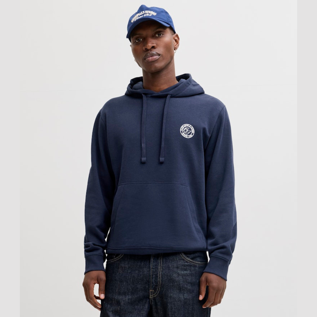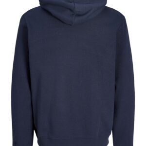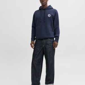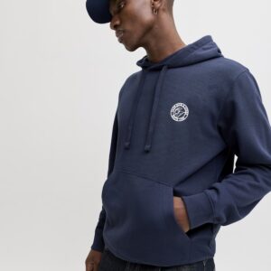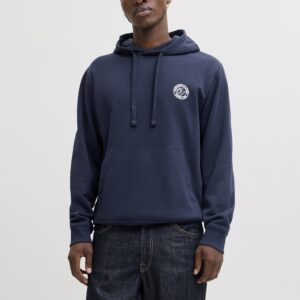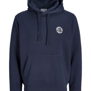 Jack&Jones tummansininen huppari, jossa edessä pieni painettu kuva. Edessä kengurutasku. Huppu jossa kiristysnyöri, hihansuissa ja helmassa resorit. Pehmeä harjattu sisäpinta. Normaali mitoitus.
