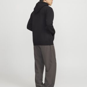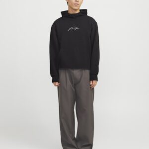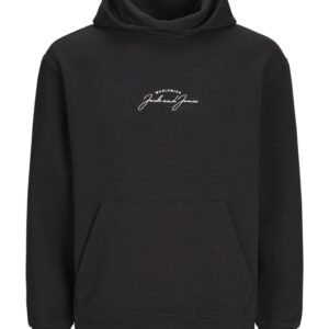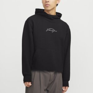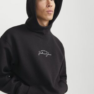 Jack & Jones musta huppari. Edessä brodeerattu Jack&Jones- teksti. Normaali mitoitus. Edessä kengurutasku, hihansuissa ja helmassa resorit. Eläväpintainen materiaali.