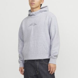 Jack & Jones harmaa huppari. Edessä brodeerattu Jack&Jones- teksti. Normaali mitoitus. Edessä kengurutasku, hihansuissa ja helmassa resorit. Eläväpintainen materiaali.