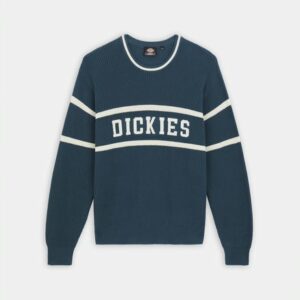 Dickies petroolin värinen neulepaita. Kudottu joustava materiaali, jossa O-pääntie ja hihansuissa ja helmassa resorit. Rento malli. Edessä Dickies teksti. Helmassa pieni Dickies merkki.