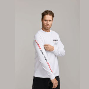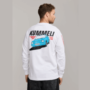 Kummeli Forever By Makia Company valkoinen unisex pitkähihainen T-paita. Normaali mitoitus. O-pääntie, suora helma, hihansuissa resorit. Edessä pieni painettu kuva, selkäpuolella iso painettu kuva. Toisessa hihassa Kummeli teksti.