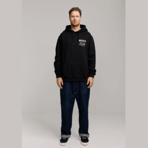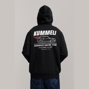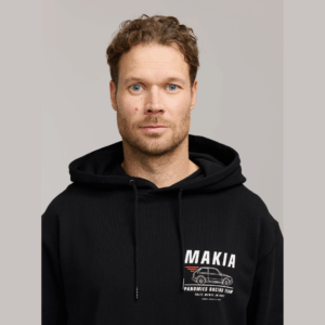 Kummeli Forever By Makia Company musta unisex huppari. Rento mitoitus. Huppu jossa kiristysnyöri, hihansuissa ja helmassa resorit. Edessä pieni painettu kuva, sekä kengurutasku. Selkäpuolella iso painettu kuva.