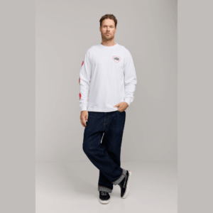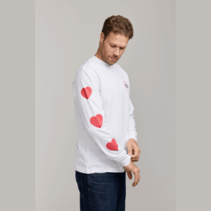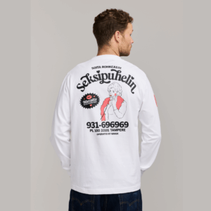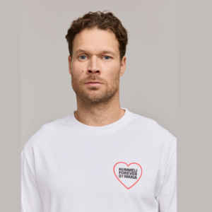 Kummeli Forever By Makia Company valkoinen unisex pitkähihainen T-paita. Normaali mitoitus. O-pääntie, suora helma, hihansuissa resorit. Edessä pieni painettu kuva, selkäpuolella iso painettu kuva. Toisessa hihassa painettuja sydämiä.