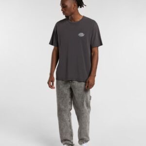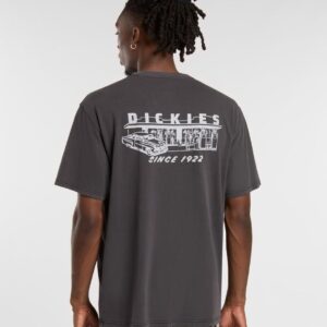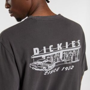 Dickies harmaa T-paita. Rento malli, O-pääntie. Edessä painettu pieni kuva, selkäpuolella iso painettu kuva. Pehmeä materiaali.