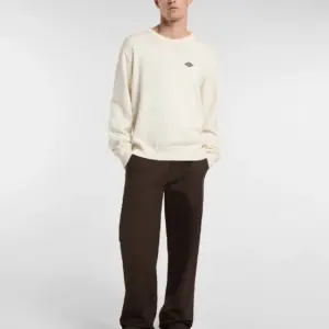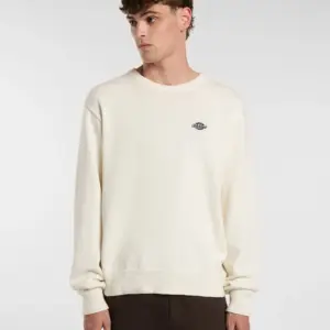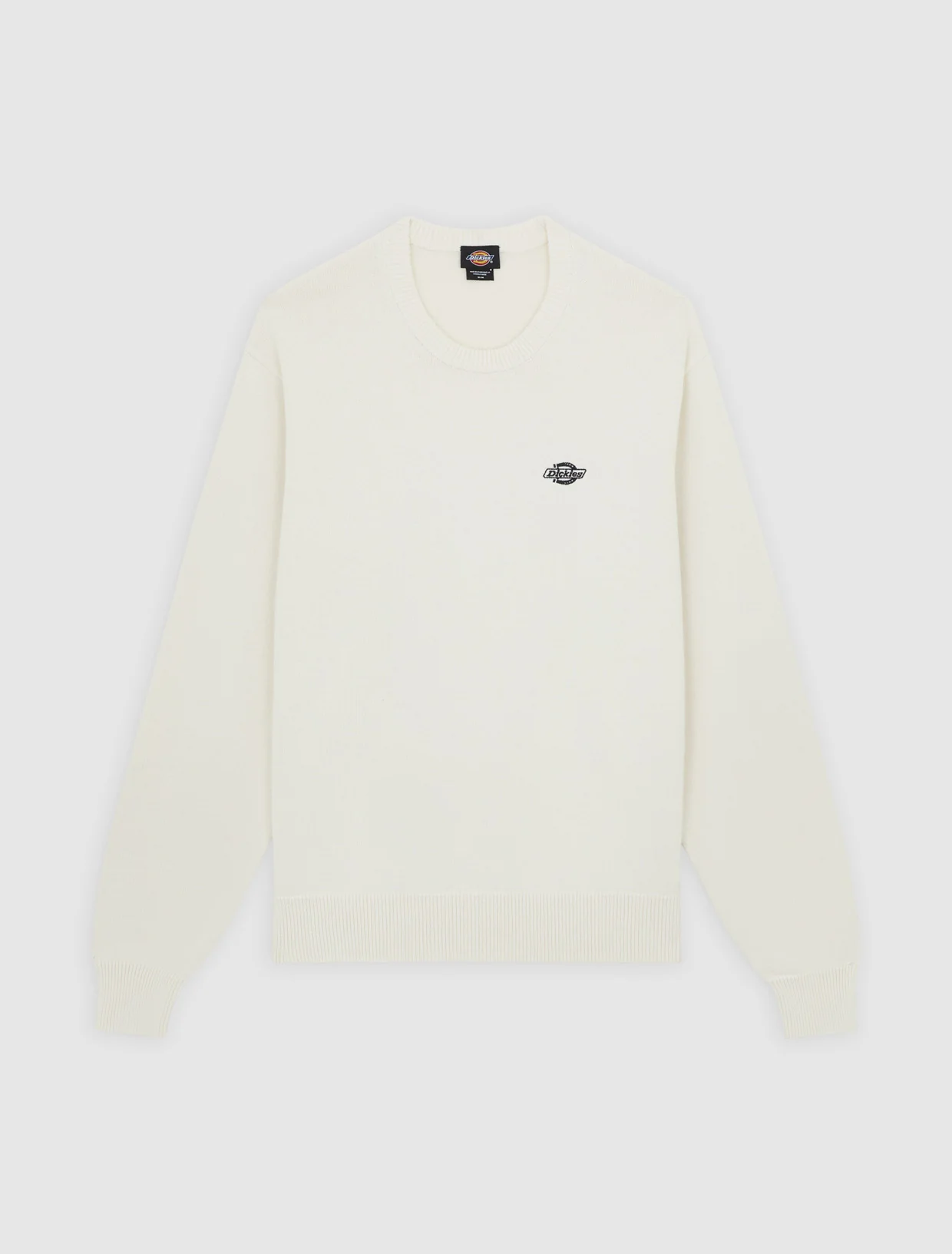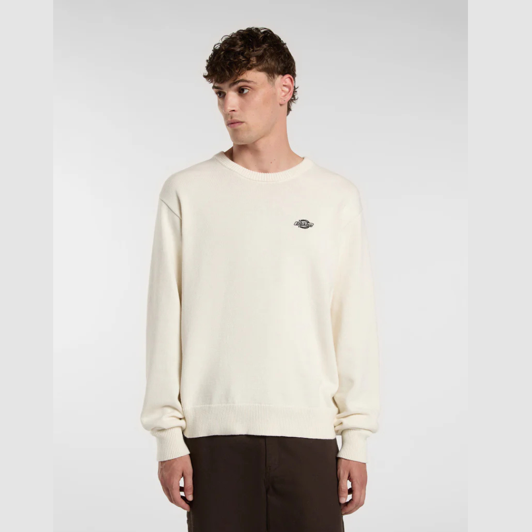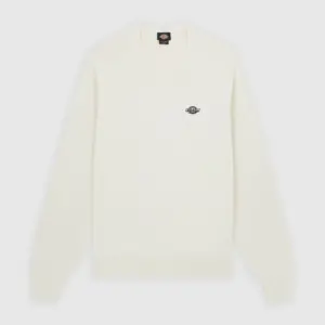 Dickies luonnonvalkoinen neulepaita. O-pääntie, hihansuissa ja helmassa resorit. Edessä pieni brodeerattu Dickies logo. Rento mitoitus.