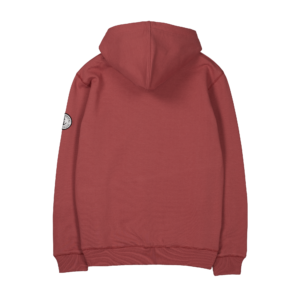 Makia marjapuuron värinen huppari. Toisessa hihassa pyöreä Makia merkki. Edessä kengurutasku. Hihansuissa ja helmassa resorit. Hupussa kiristysnyöri.