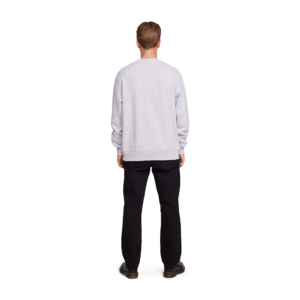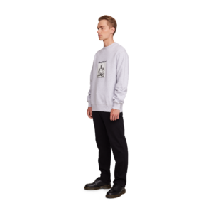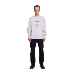 Makia & Tom of Finland – malliston vaaleanharmaa swetari. Edessä painettu kuva. O-pääntie, hihansuissa ja helmassa resorit. Pehmeä harjattu sisäpinta.