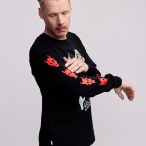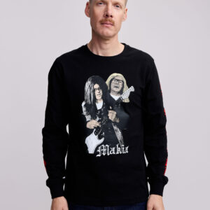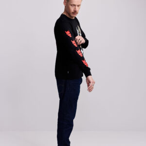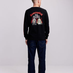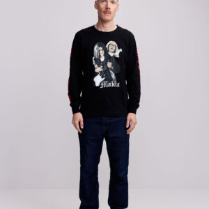 Makia Kummeli malliston musta pitkähihainen paita. Unisex malli.  Edessä sekä takana painetut kuvat, hihoissa painetut tekstit/kuviot. O-pääntie, suora helma, hihansuissa resorit.
