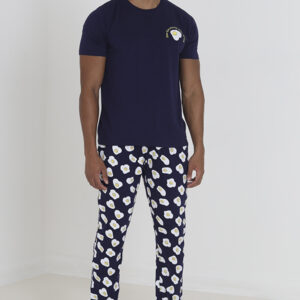 Miesten tummansininen yöasu. T-paita jossa O-pääntie, pieni painettu kuva edessä. Pitkät housut, joissa painettuja kuvioita. Joustava vyötärökaistale jossa solmittavat nyörit. Taskut sivuilla. Pehmeä materiaali.