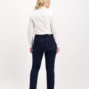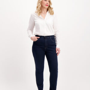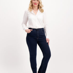 Very Nice tummansininen naisellinen Caramel farkku. Korkea vyötärö, vetoketju kiinnitys, vyölenkit. Suora lahje, tilava reisi. Taskut edessä sekä takana. Joustava materiaali.