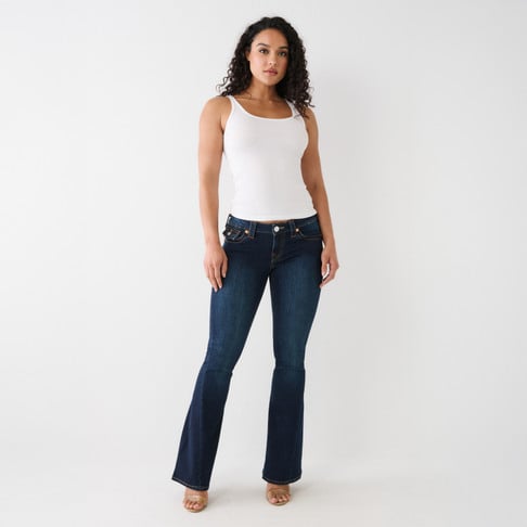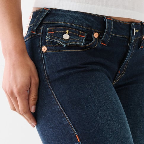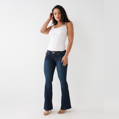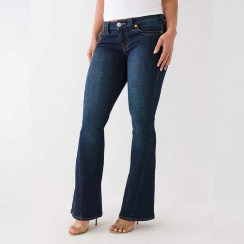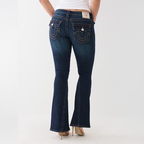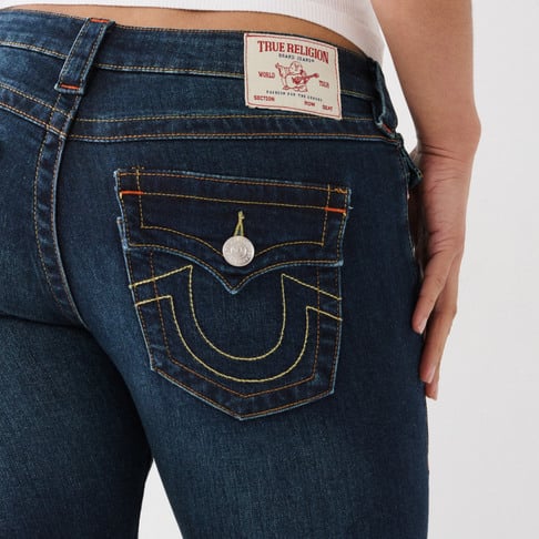 True Religion tummasininen farkku. Joustava materiaali. Matala vyötärö. Alaspäin levenevä lahje. Läpälliset takataskut. Kiertävä lahkeen sauma. Yksi lahkeen pituus.