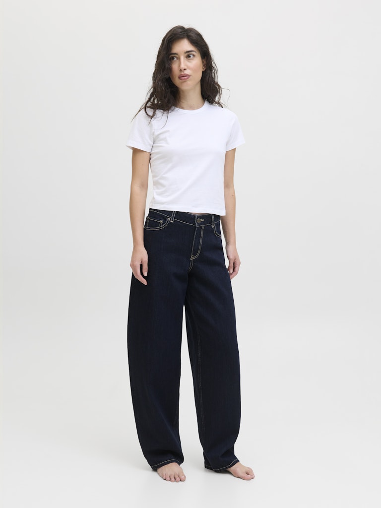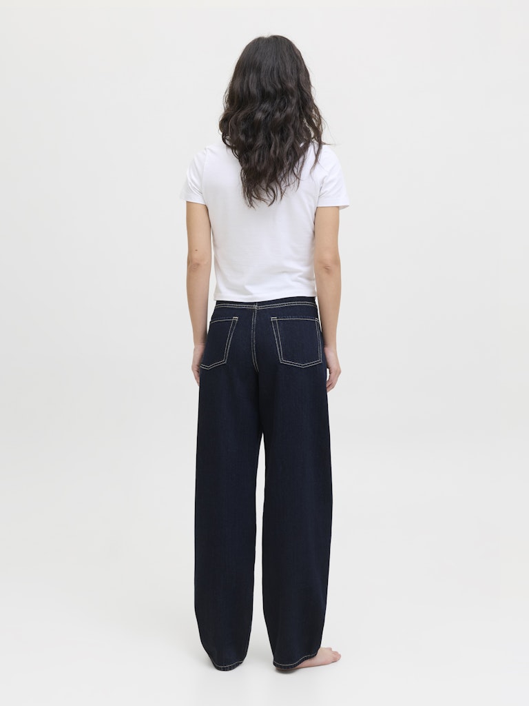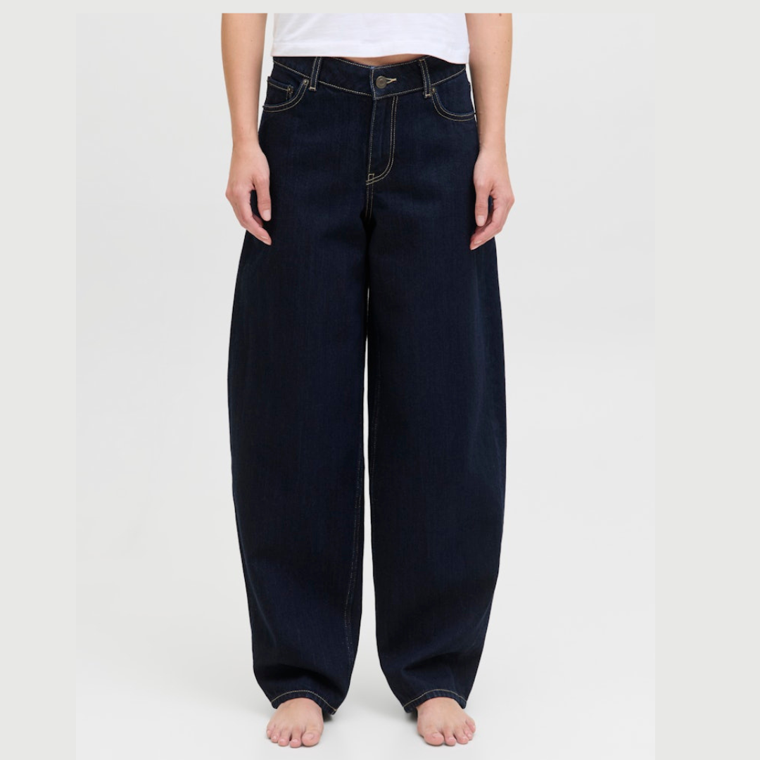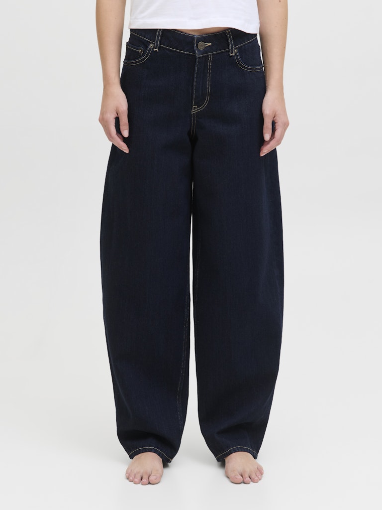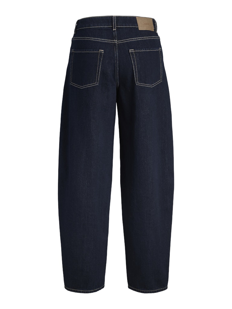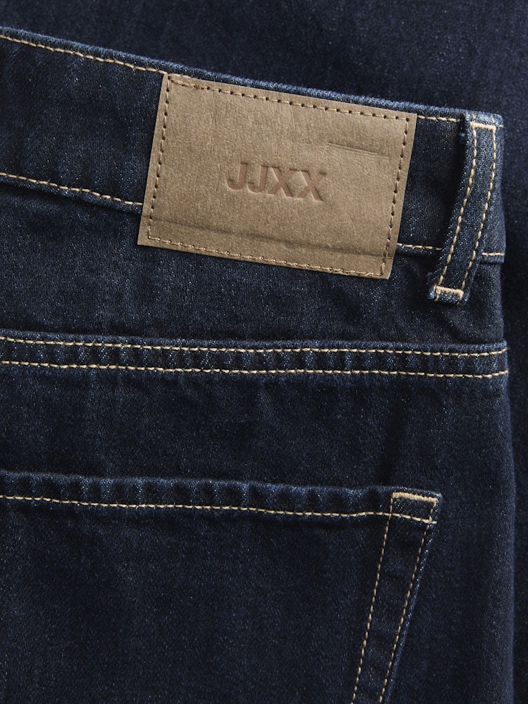 JJXX tummansininen kuluttamaton farkku. Normaali korkuinen vyötärö. Joustamaton materiaali. Leveä barrel malli. 5-taskumalli, vetoketju + nappi kiinnitys.