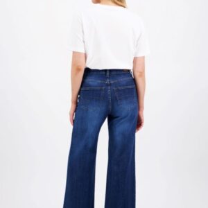 Naisten trendikkäät ja leveälahkeiset farkut, jotka istuvat hyvin lantiolta ja vyötäröltä. Korkea vyötärö yhdistettynä levenevään lahkeeseen luo modernin ja imartelevan siluetin. Lahkeen linja levenee alaspäin. Farkkujen sävy on klassinen indigon sininen ja niissä on vettä säästävällä lasertekniikalla tehty kulutus. Materiaali on päällä pehmeä ja siinä on pientä joustoa.