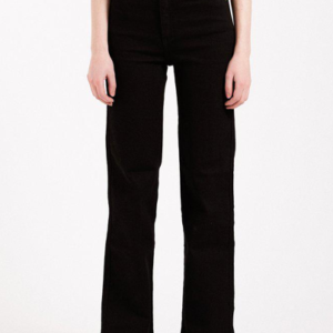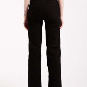 Dr.Denim musta suoralahkeinen farkku. Korkea vyötärö, jossa vyötärökaistaleen sisällä joustava kuminauha, joka takaa napakan istuvuuden. Vetoketju kiinnitys, taskut edessä ja takana. Vyölenkit. Leveä suora lahje, istuva yläosa. Joustava napakka materiaali.