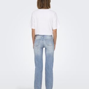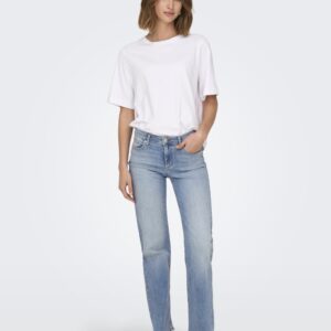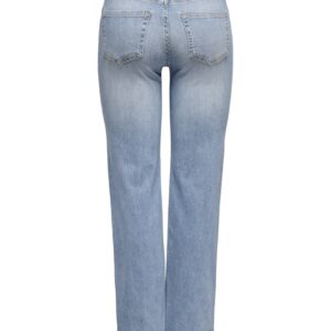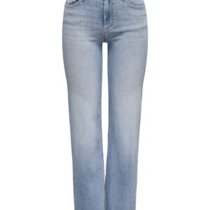 Only vaaleansininen suoralahkeinen farkku. Normaali vyötärö, joustava pehmeä materiaali. Vetoketju + nappi kiinnitys. 5-tasku malli, vyölenkit.