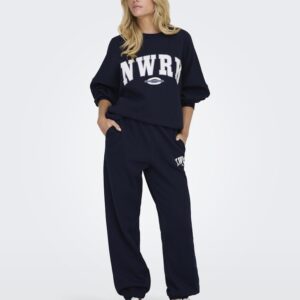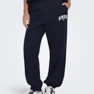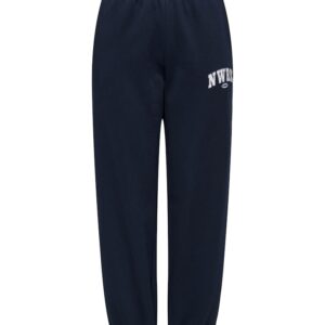 Only tummansininen swetari housu. Rento malli. Painettu teksti toisessa lahkeessa. Joustava koskea kuminauha vyötärö, taskut sivuilla. Lahkeissa resorit. Pehmeä harjattu sisäpinta.