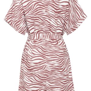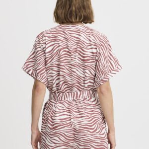 B.young luonnonvalkoinen/punainen kuviollinen haalari. Lyhyet lahkeet, rento malli. V-pääntie, napitus edessä. Vyötäröllä irrotettava solmittava vyö. Taskut sivuilla.