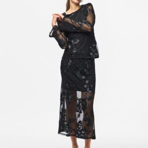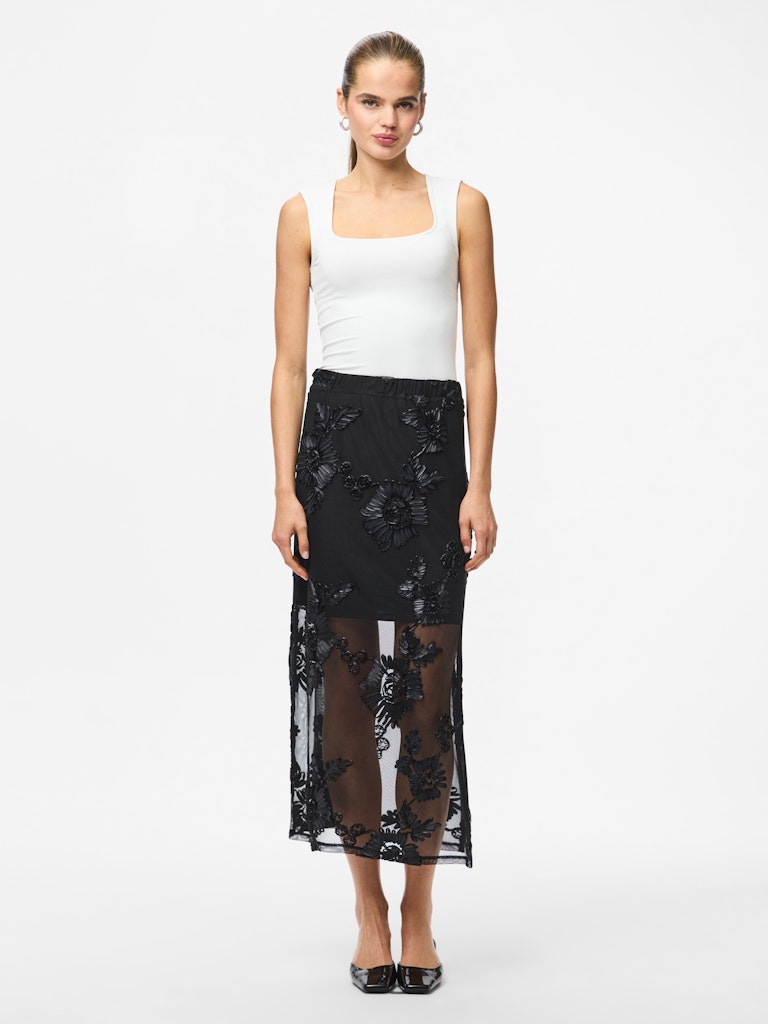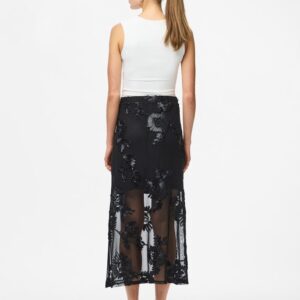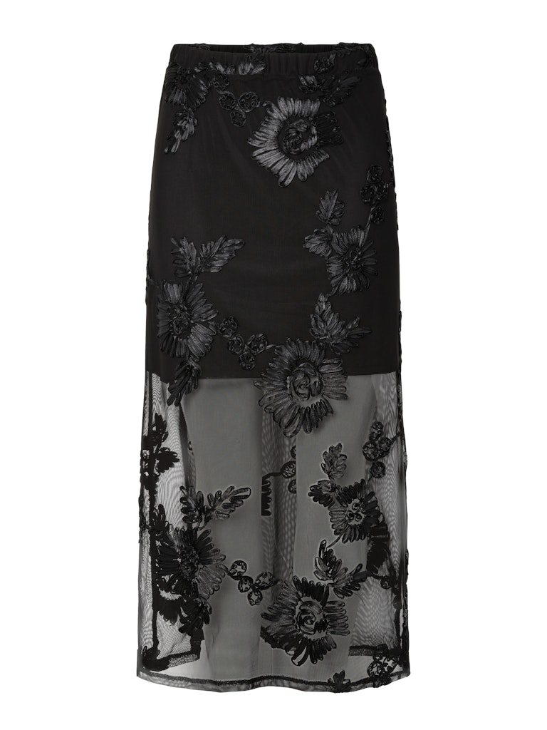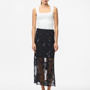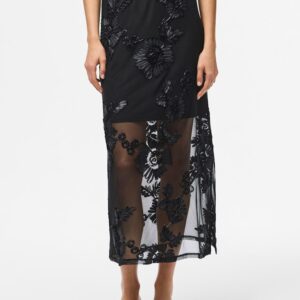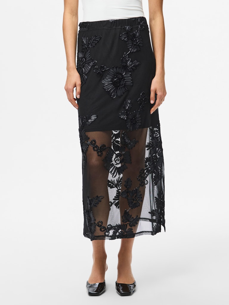 Pieces musta midimittainen joustava hame. Verkkotyyppinen päällikangas, jossa kohokuvioita. Korkea kuminauha vyötärö. Lyhyt alushame. Toisella sivulla halkio.