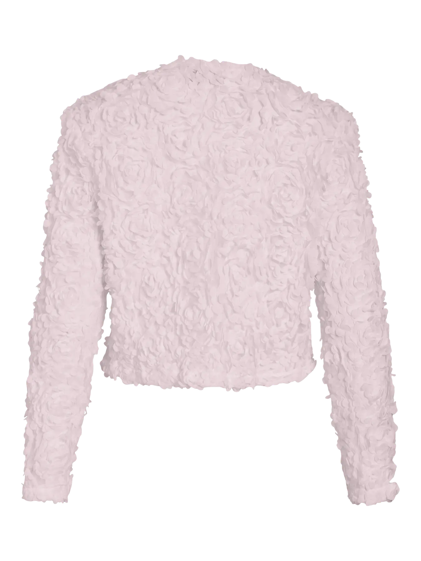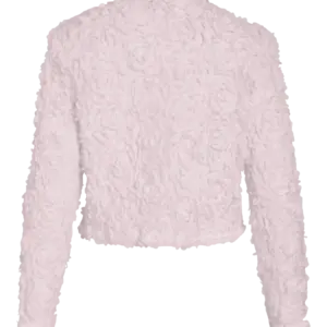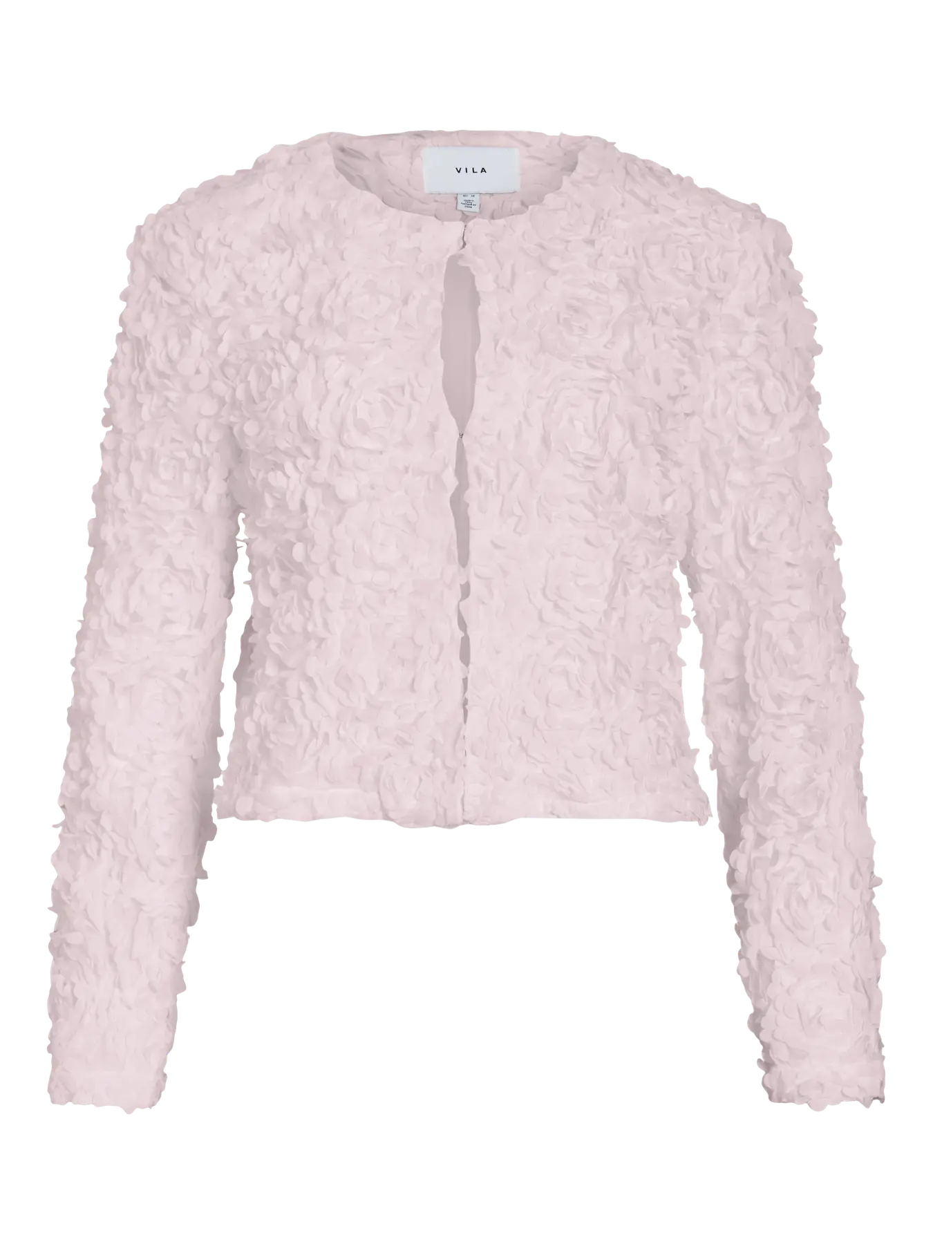 Vila hempeän vaaleanpunainen lyhyt jakku. Eläväpintainen läpikuultava päällikangas, sisäpuolella ohut vuorikangas. O-pääntie. Kiinnitys edestä kahdella hakasella.