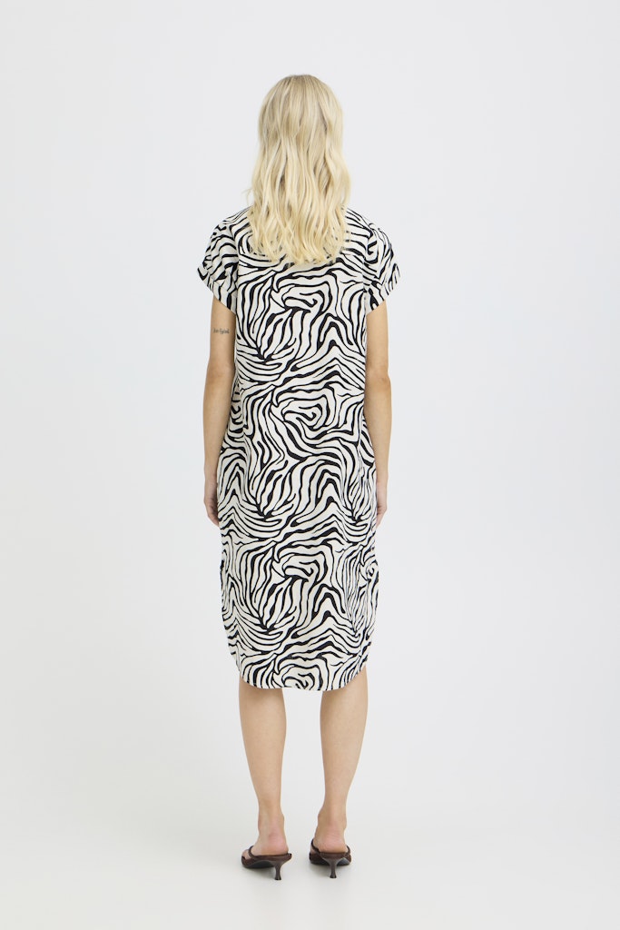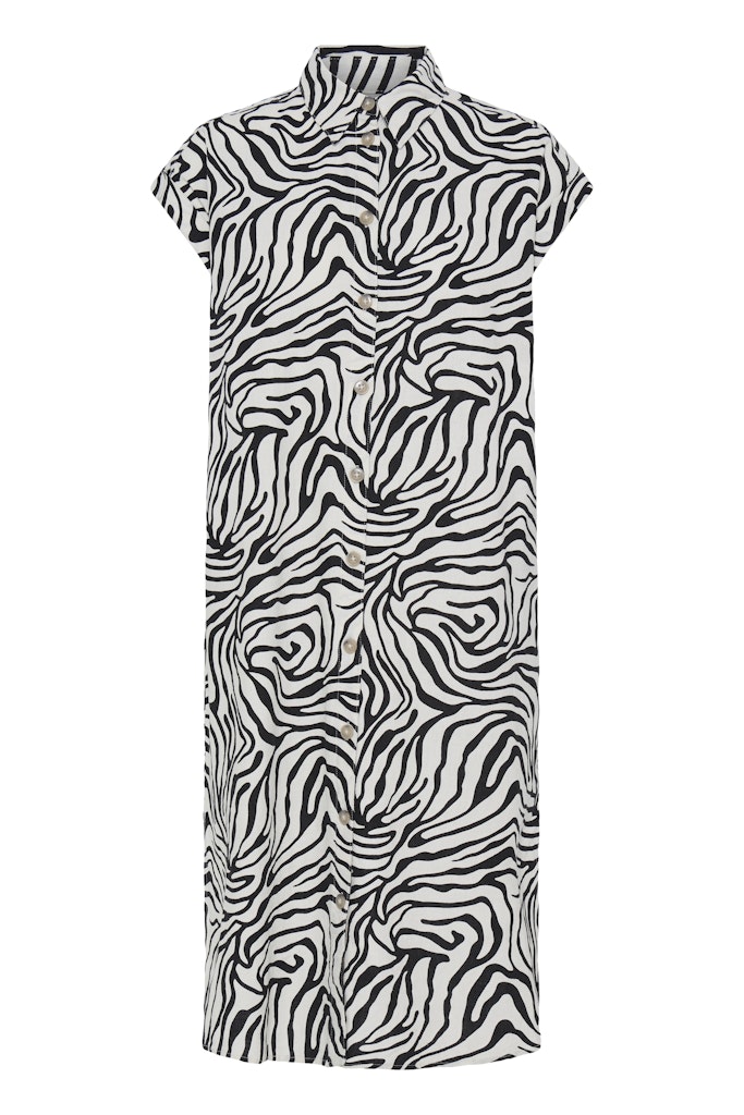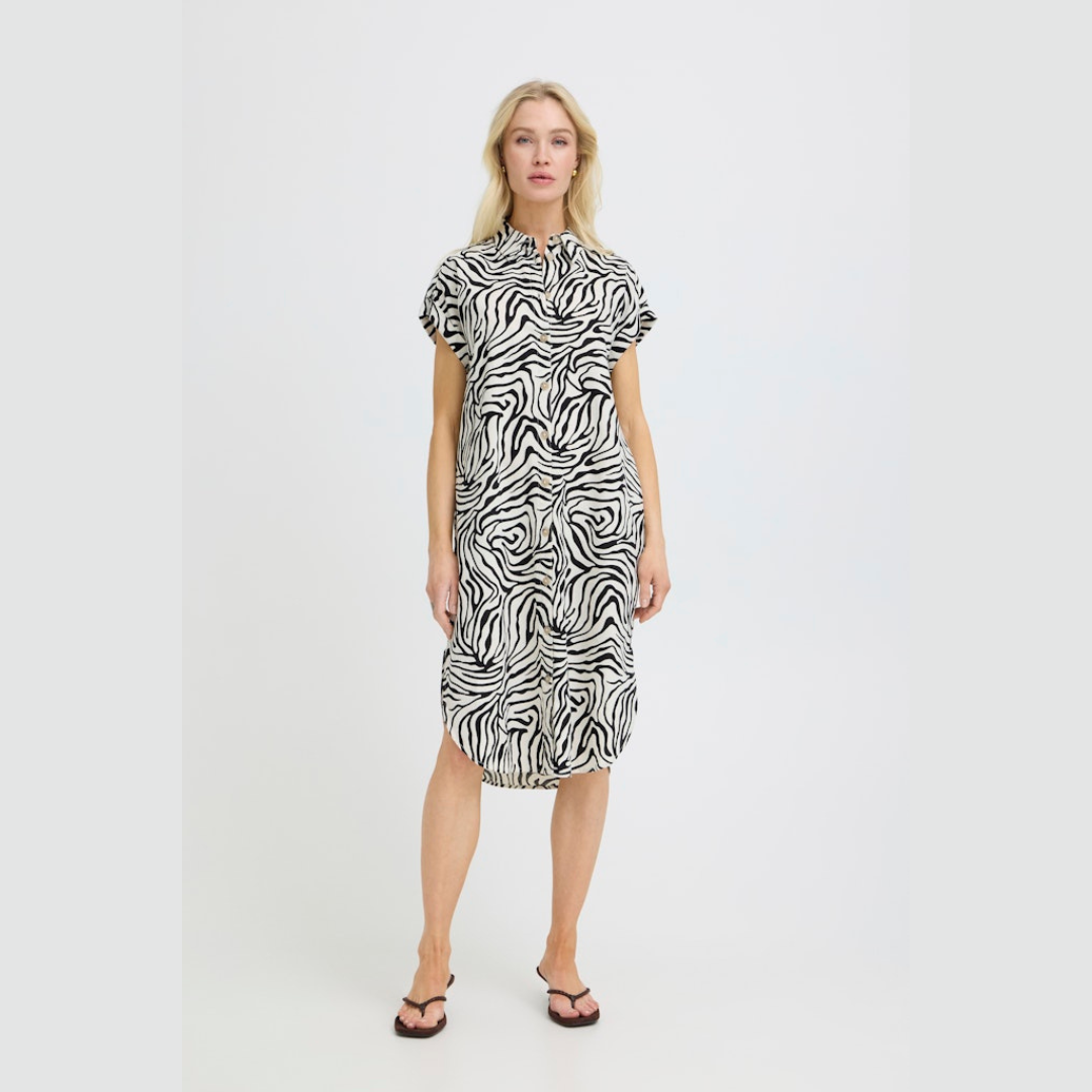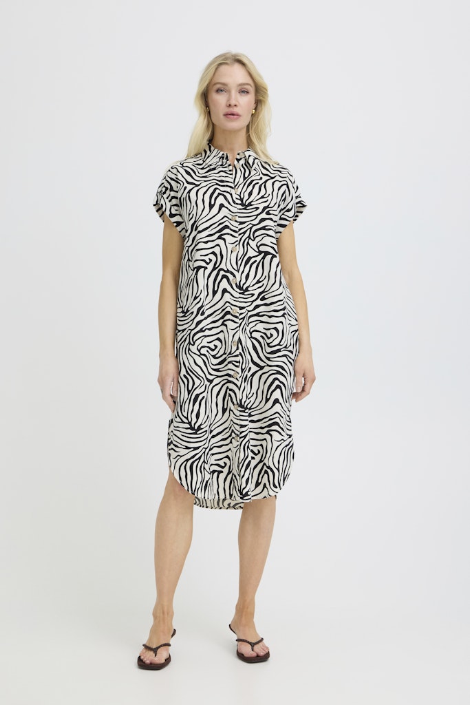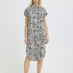 B.young kuviollinen paitismekko. Suora rento malli, taskut sivuilla. Napitus edessä, lyhyet hihat, joissa käännökset reunassa. Pyöristetty sivuilta lyhyempi helma.