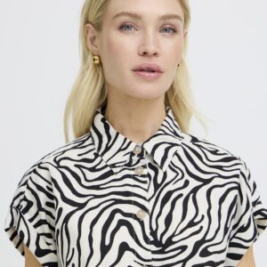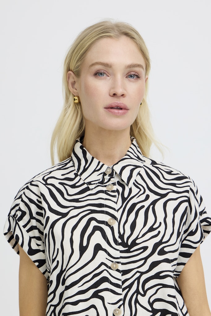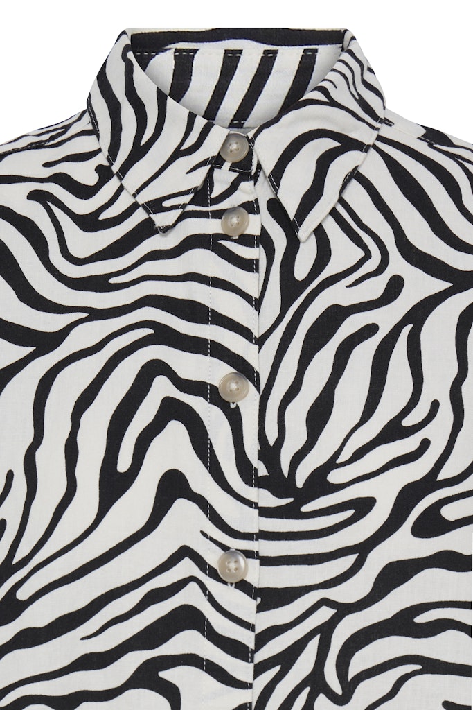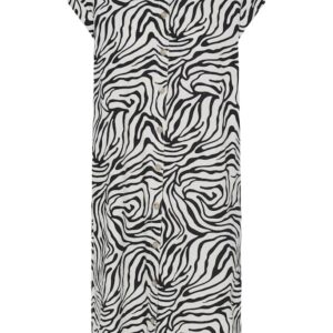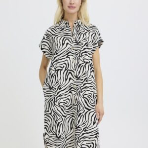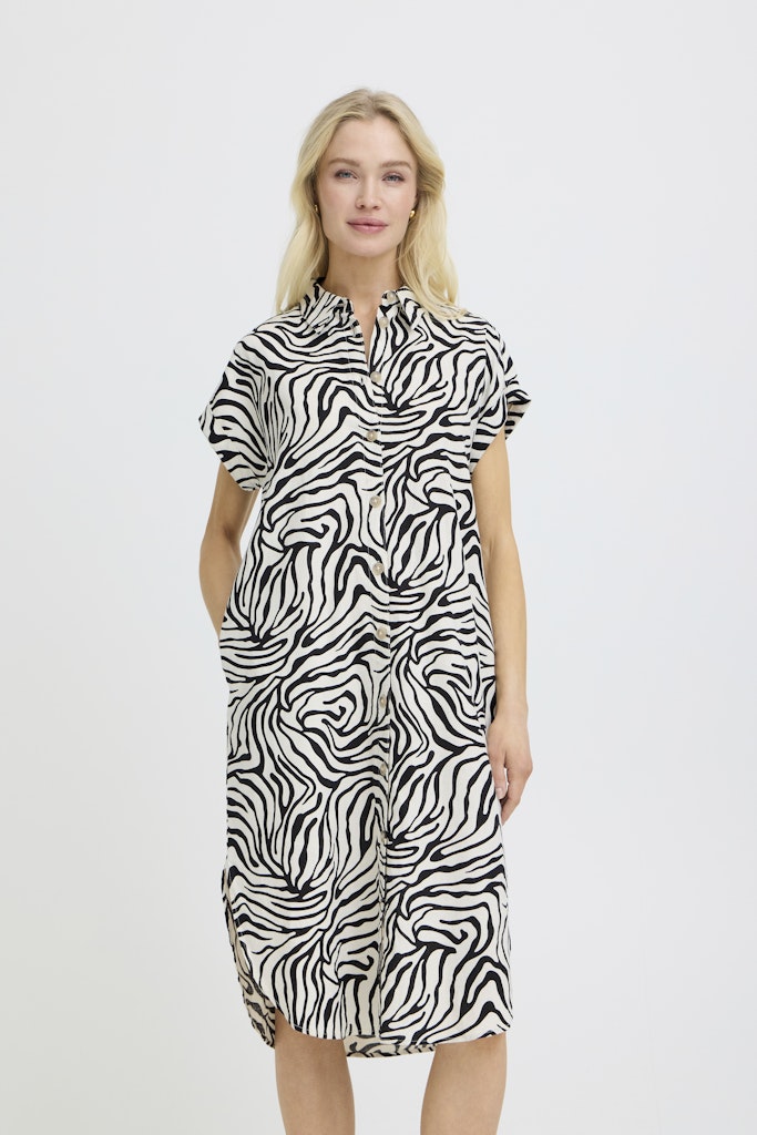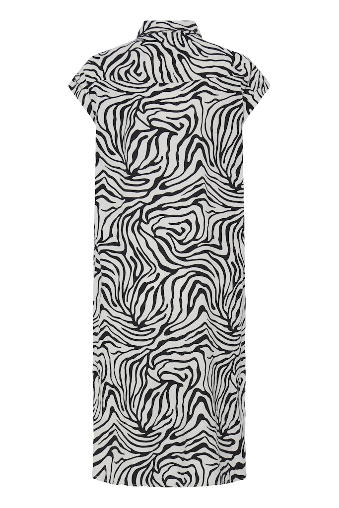 B.young kuviollinen paitismekko. Suora rento malli, taskut sivuilla. Napitus edessä, lyhyet hihat, joissa käännökset reunassa. Pyöristetty sivuilta lyhyempi helma.