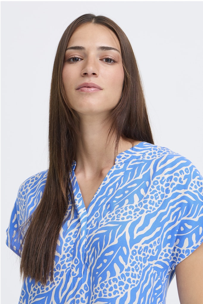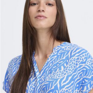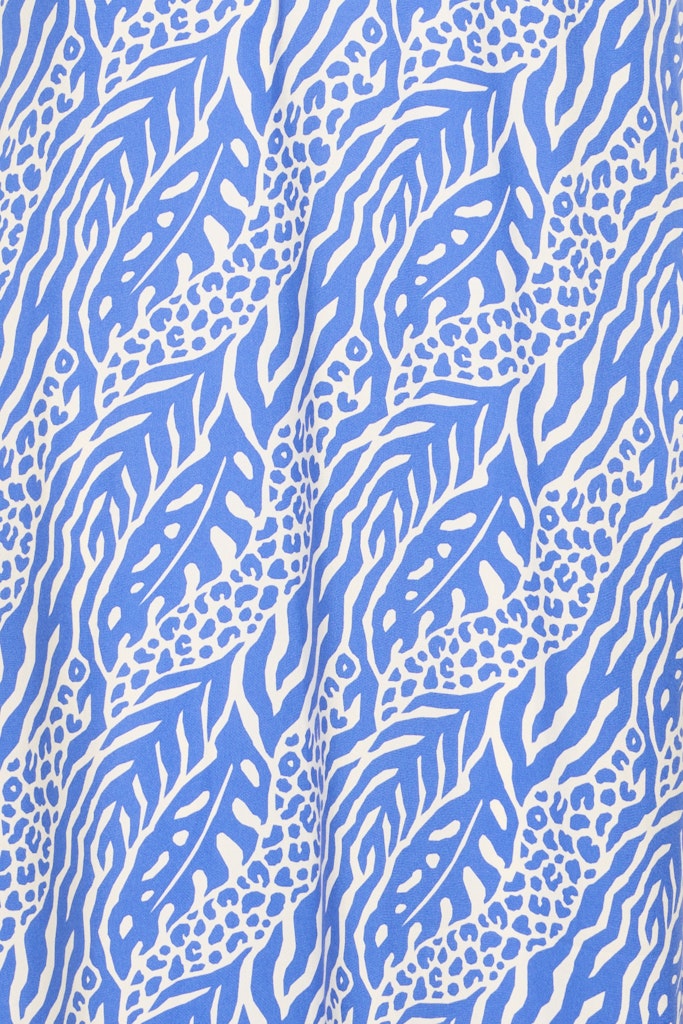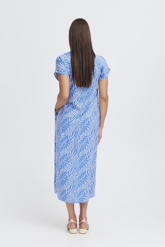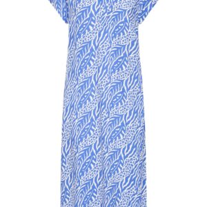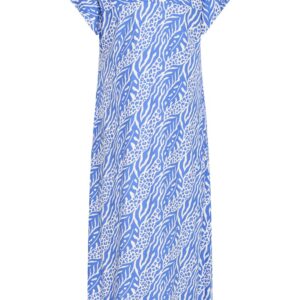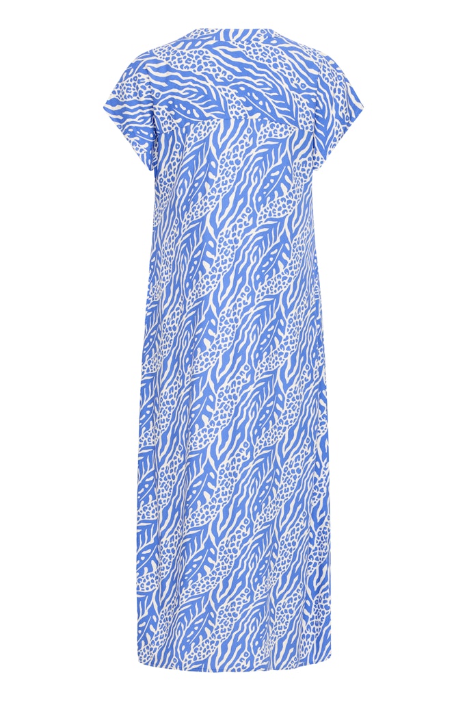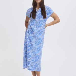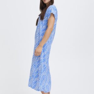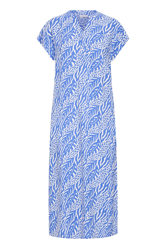 B.young sinikuviollinen pitkä mekko. Suora rento malli, tskut sivuilla. Lyhyet hihat. V-mallinen pääntie.
