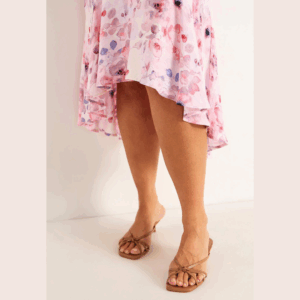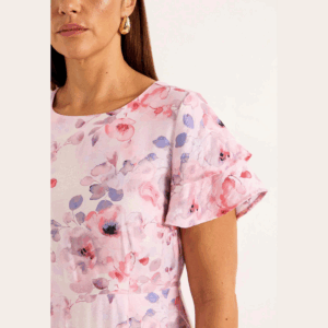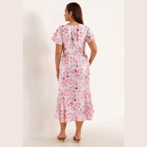 Cellbes vaaleanpunainen kukkakuvioinen pitkä mekko. O-pääntie, takana vetoketju. Lyhyet perhosmalliset hihat. Poikkileikkaus vyötäröllä. Etuosasta lyhyempi helma, helmassa frilla. Joustamaton materiaali.