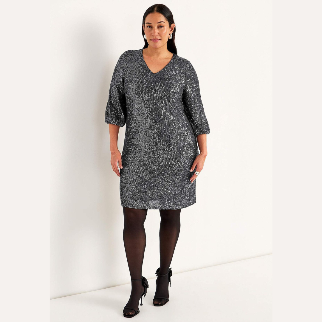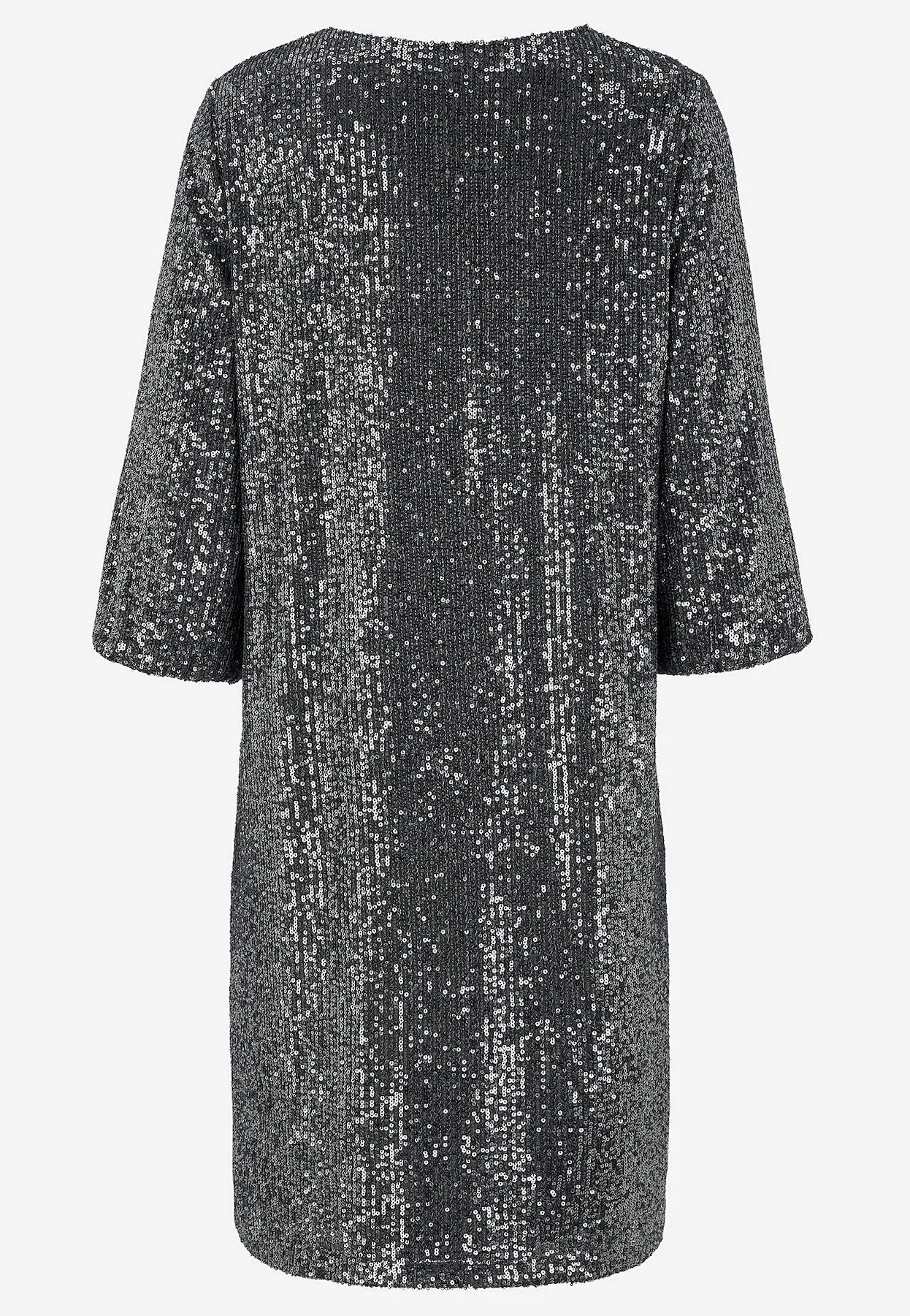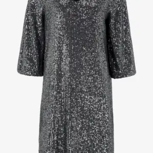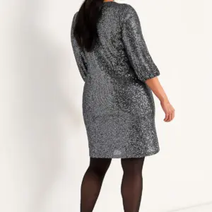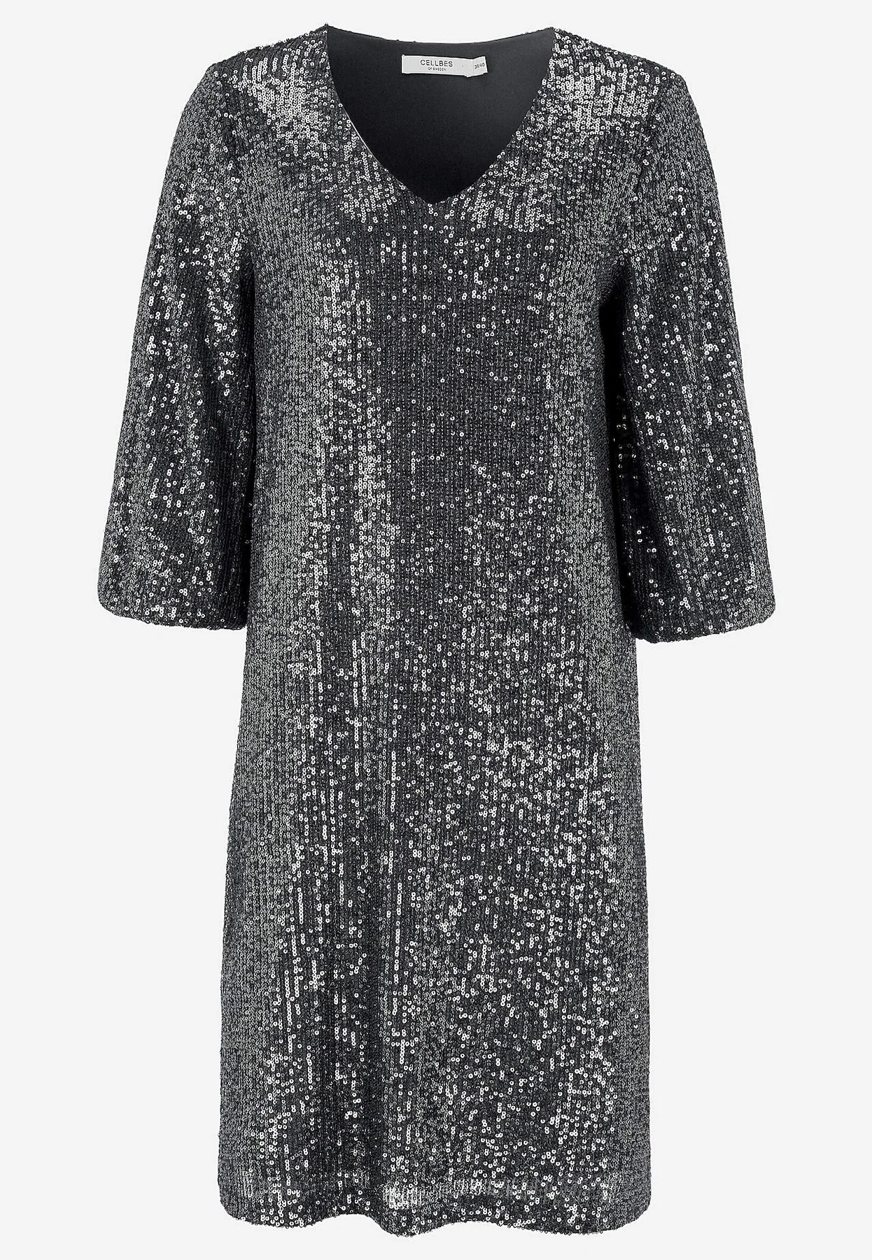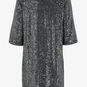 Cellbes tummanharmaa paljetti mekko. V-pääntie, suora helma. 3/4 mittaiset hihat, joissa joustava hihansuu. Joustava materiaali, ohut joustava vuorikangas.