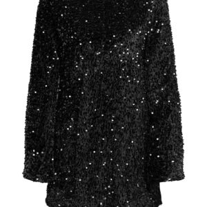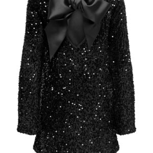Only musta paljettimekko. Joustava materiaali, ohut vuorikangas. Syväänuurrettu selkäosa, jossa iso solmittava rusetti. Pitkät levenevät hihat.