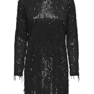 Only mustaeläväpintainen paljetti mekko. O-pääntie, niskassa nappi sekä halkio. Pitkät hihat, suora helma. Joustava materiaali. Ohut vuorikangas.