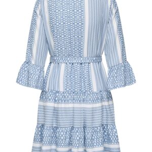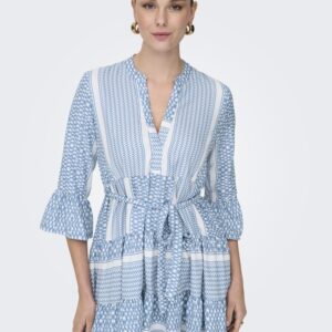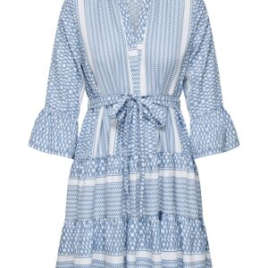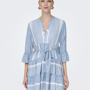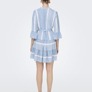 Only valkoinen/vaaleansininen kuviollinen mekko. Alaspäin levenevä helma, vyötäröllä irrotettava solmittava nauha. 3/4 mittaiset hihat. Laskeutuva joustamaton materiaali.