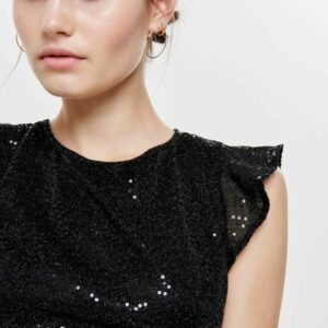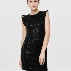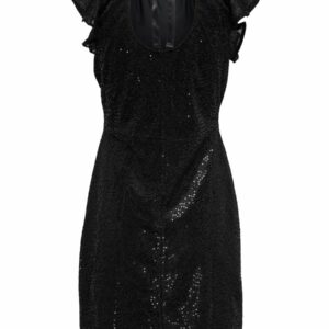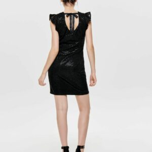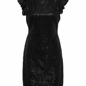 Only musta paljettimekko. Lyhyt kapea malli. Joustava materiaali. Ohut vuorikangas. Lyhyet frillahihat. O-pääntie, selkäpuolella niskassa solmittavat satiininauhat.