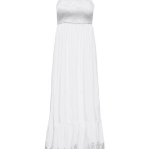 Only valkoinen nilkkamittainen mekko. Säädettävät irrotettavat ohuet olkaimet. Joustava smokkirypytys mekon yläosassa. Helmassa reikäkuviointi. Ohut vuorikangas.
