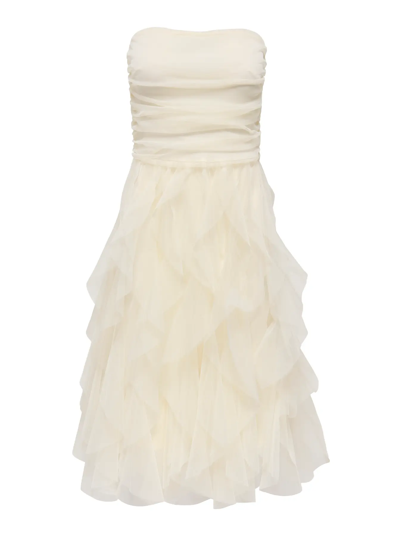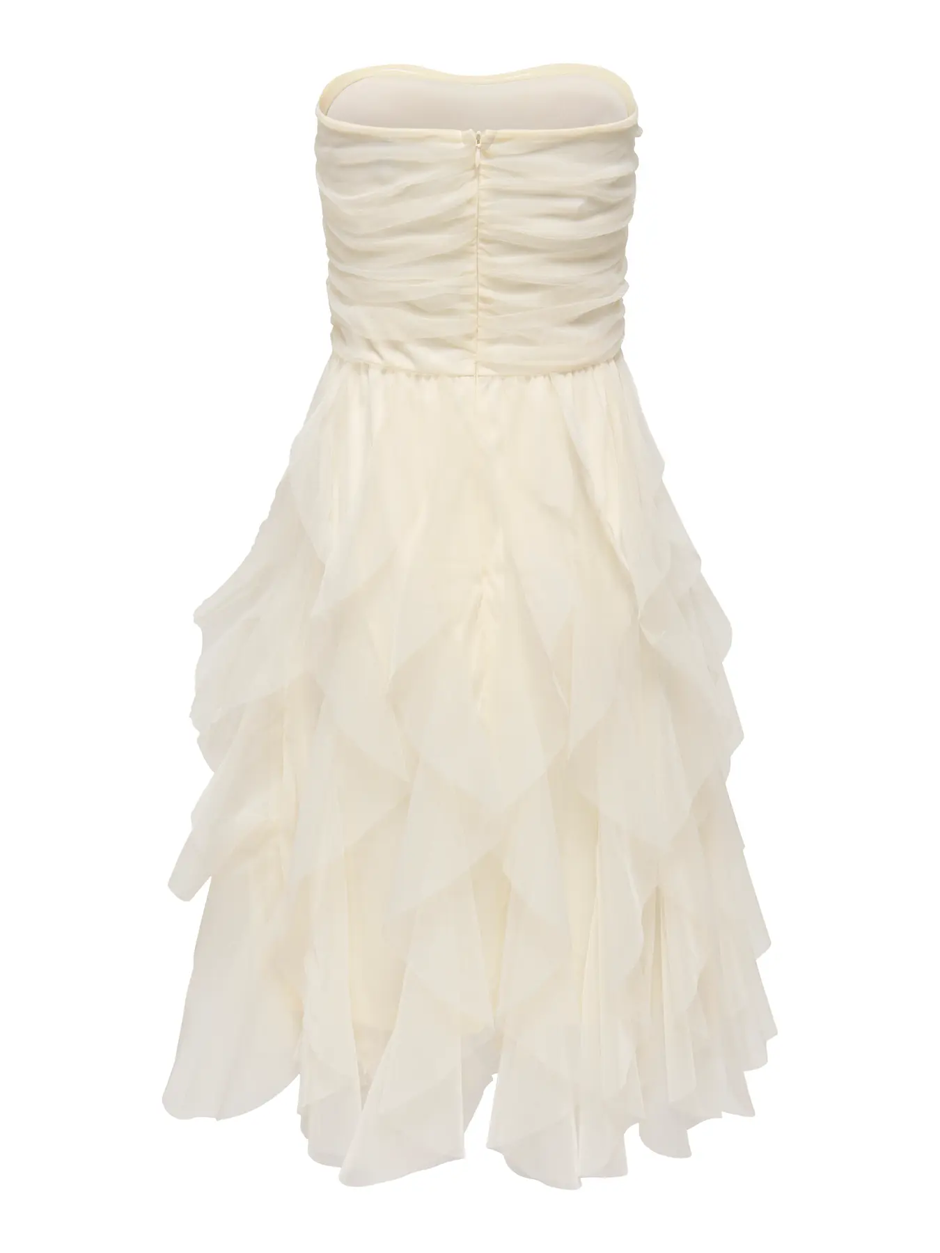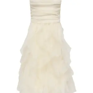 Only kerman valkoinen tyllimekko. Olkaimeton tuubimallinen yläosä, jonka sisäreunassa silikooni nauha ( estää valumisen päällä). Joustava materiaali. Takana vetoketjukiinnitys. Joustava vuorikangas.