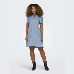 Only vaaleansininen mekko. Rento malli. V-pääntie, lyhyet hihat. Joustamaton materiaali. Poikkileikkaukset helmassa.
