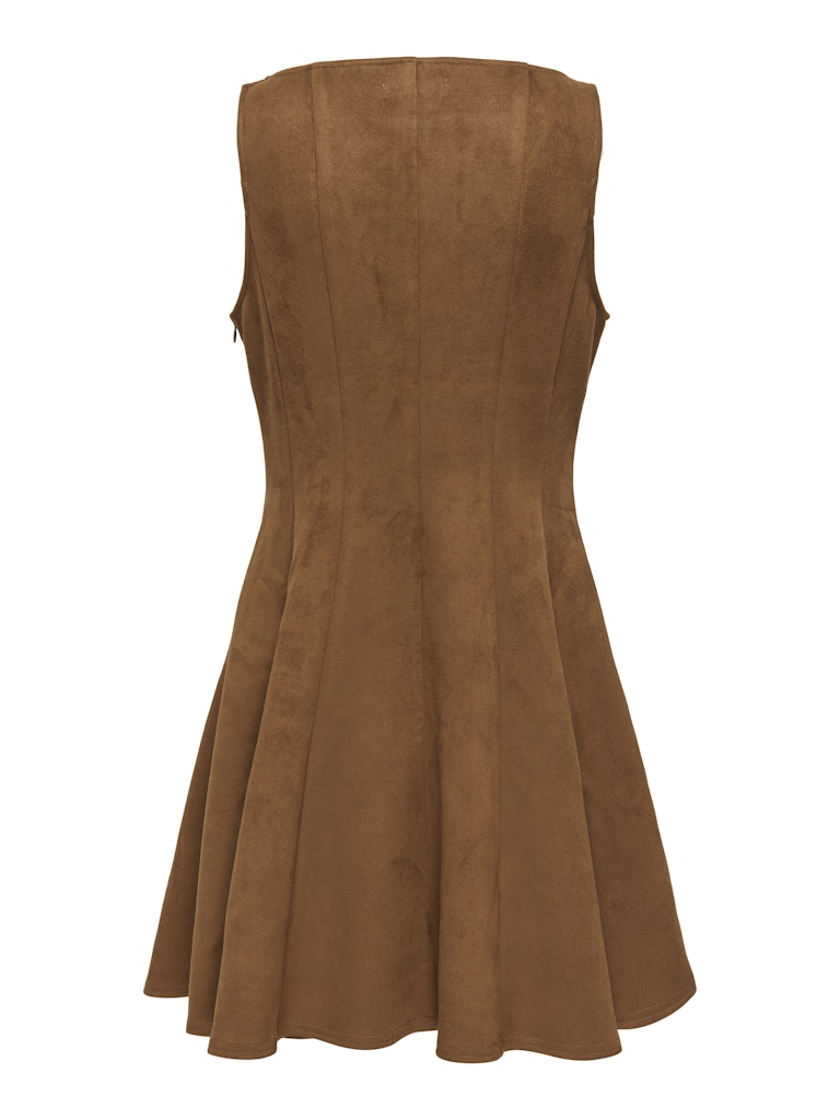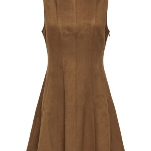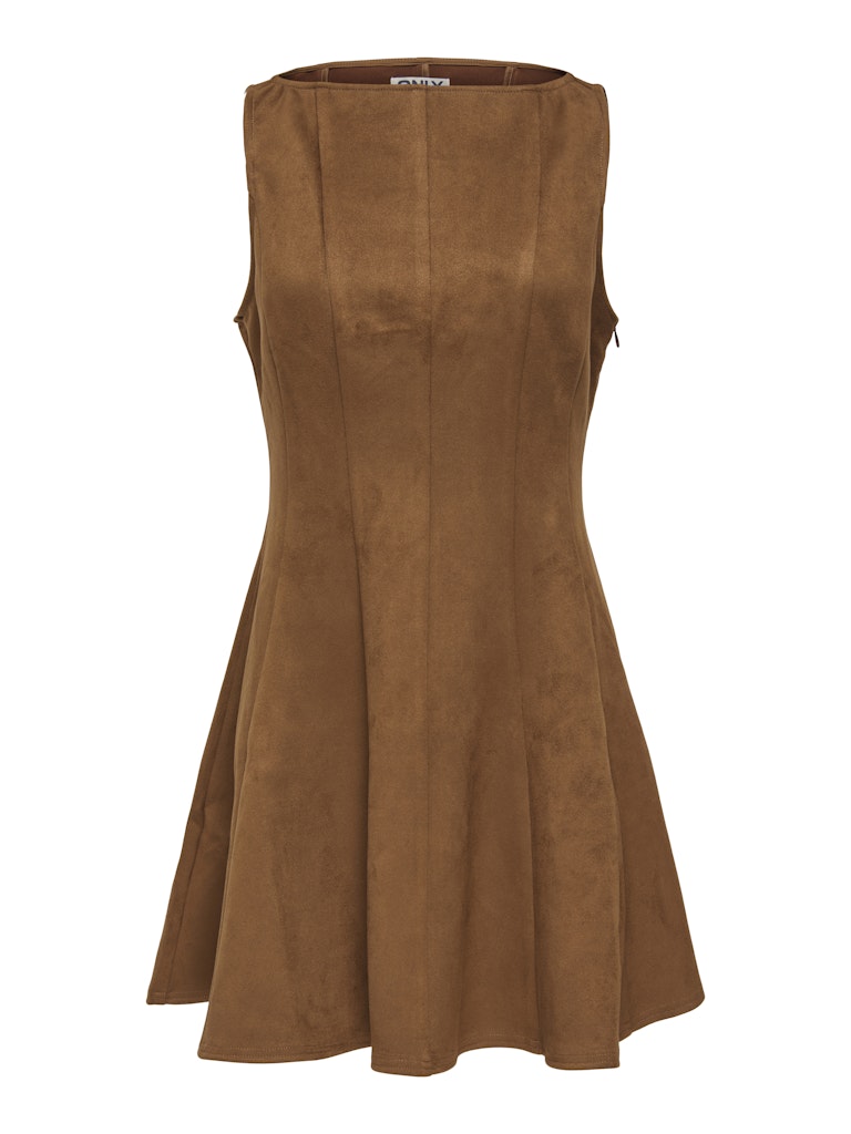 Only konjakin ruskea mekko. Joustava mokkatyyppinen materiaali. Hihaton malli. Levenevä helma. Toisella sivulla yläosassa vetoketju.