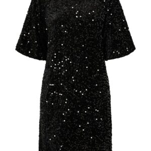 Pieces musta paljettimekko. O-pääntie, suora malli. Joustava materiaali. Suorat lyhyet hihat.