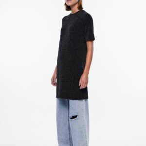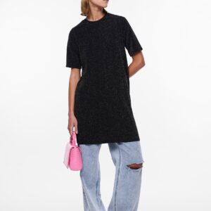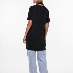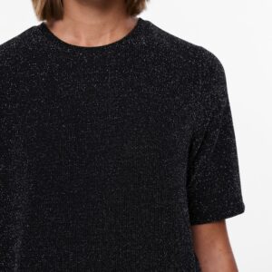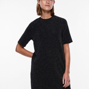 Pieces musta mekko, jossa hopeanväristä kimalletta. O-pääntie, lyhyet hihat. Joustava materiaali. Suora rento malli.